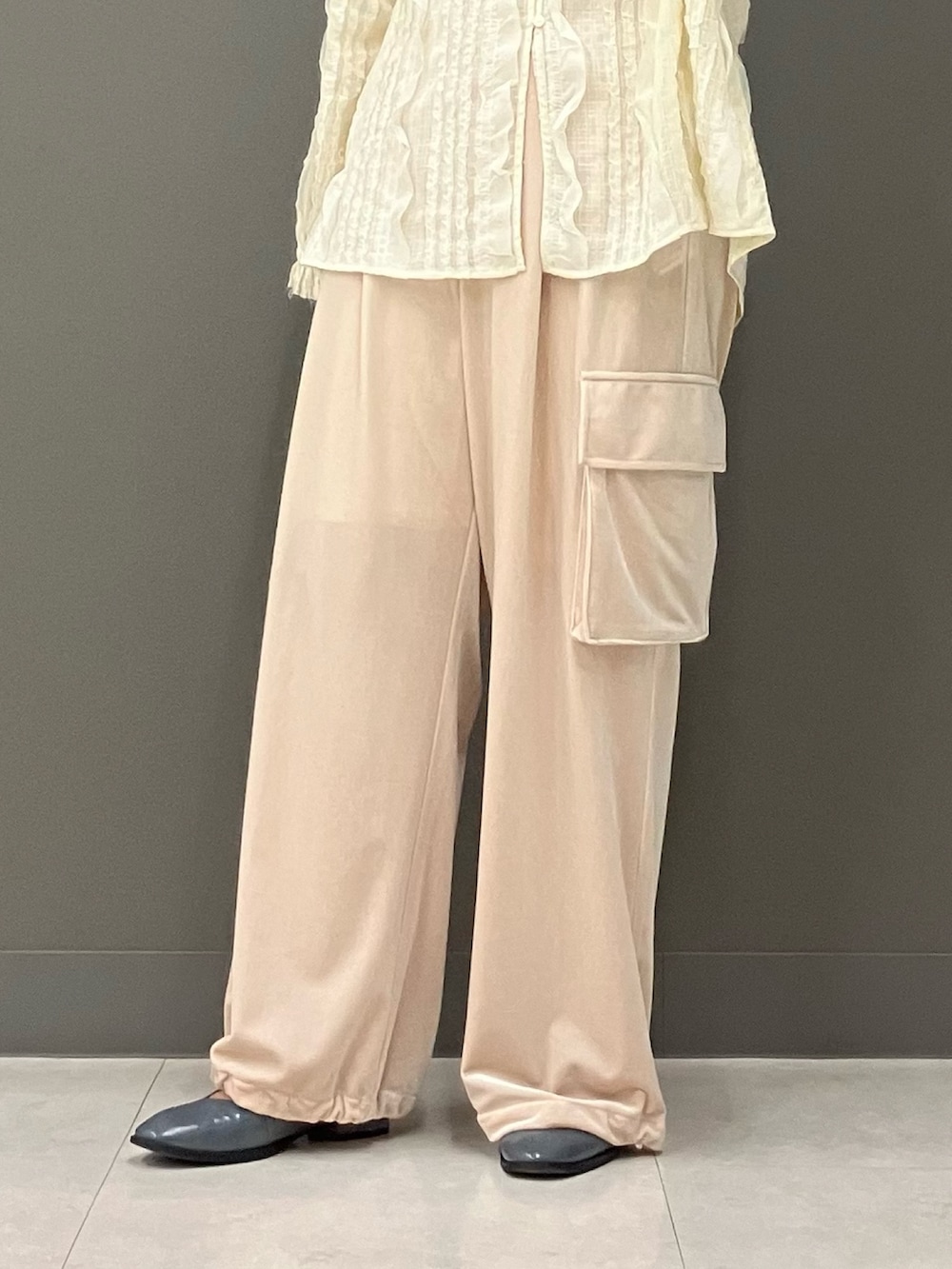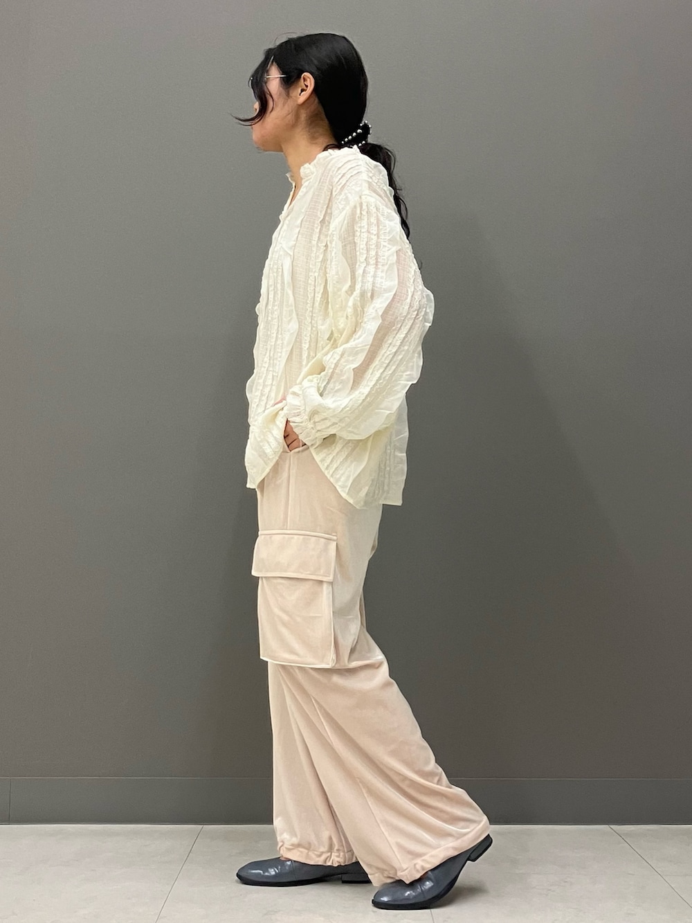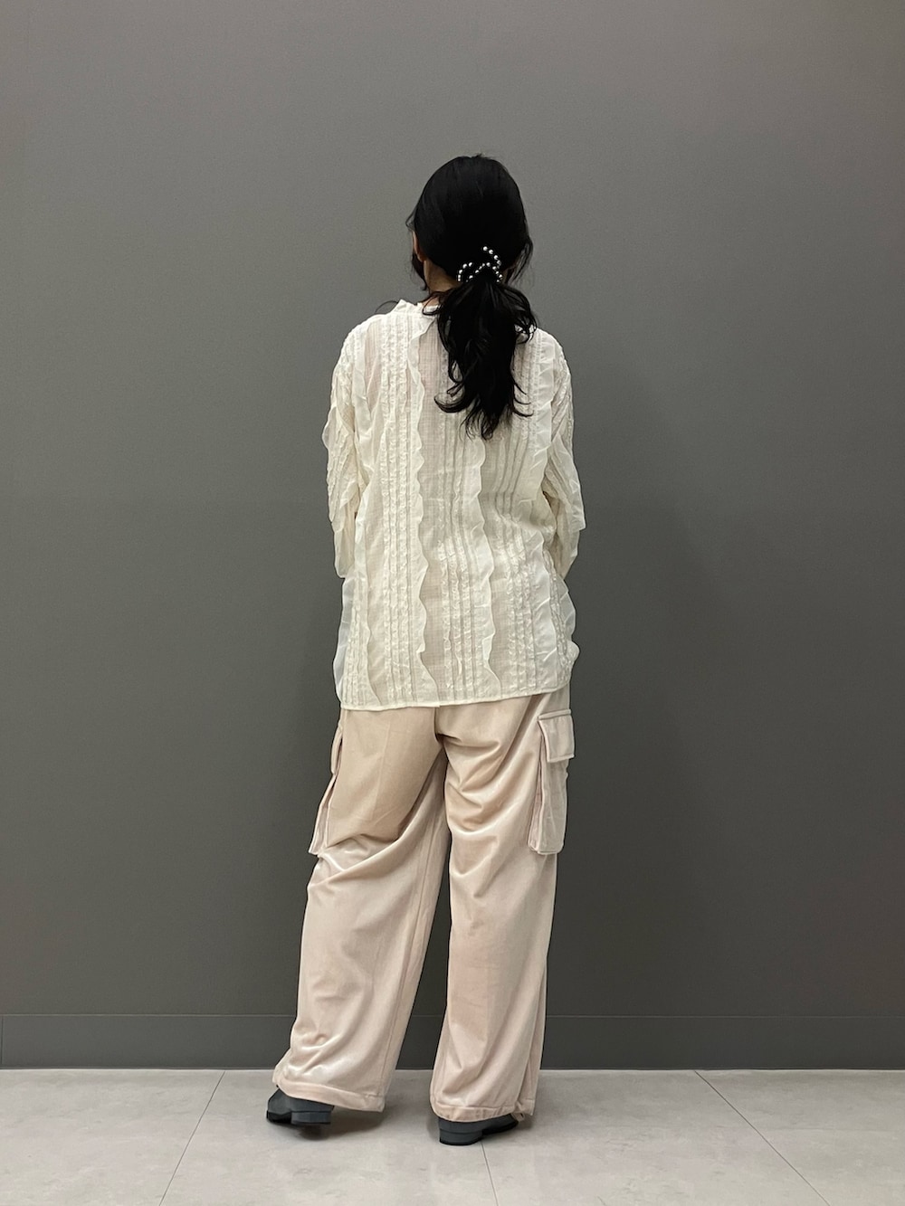 可愛いレースシャツをカーゴパンツ合わせでカジュアルダウン!