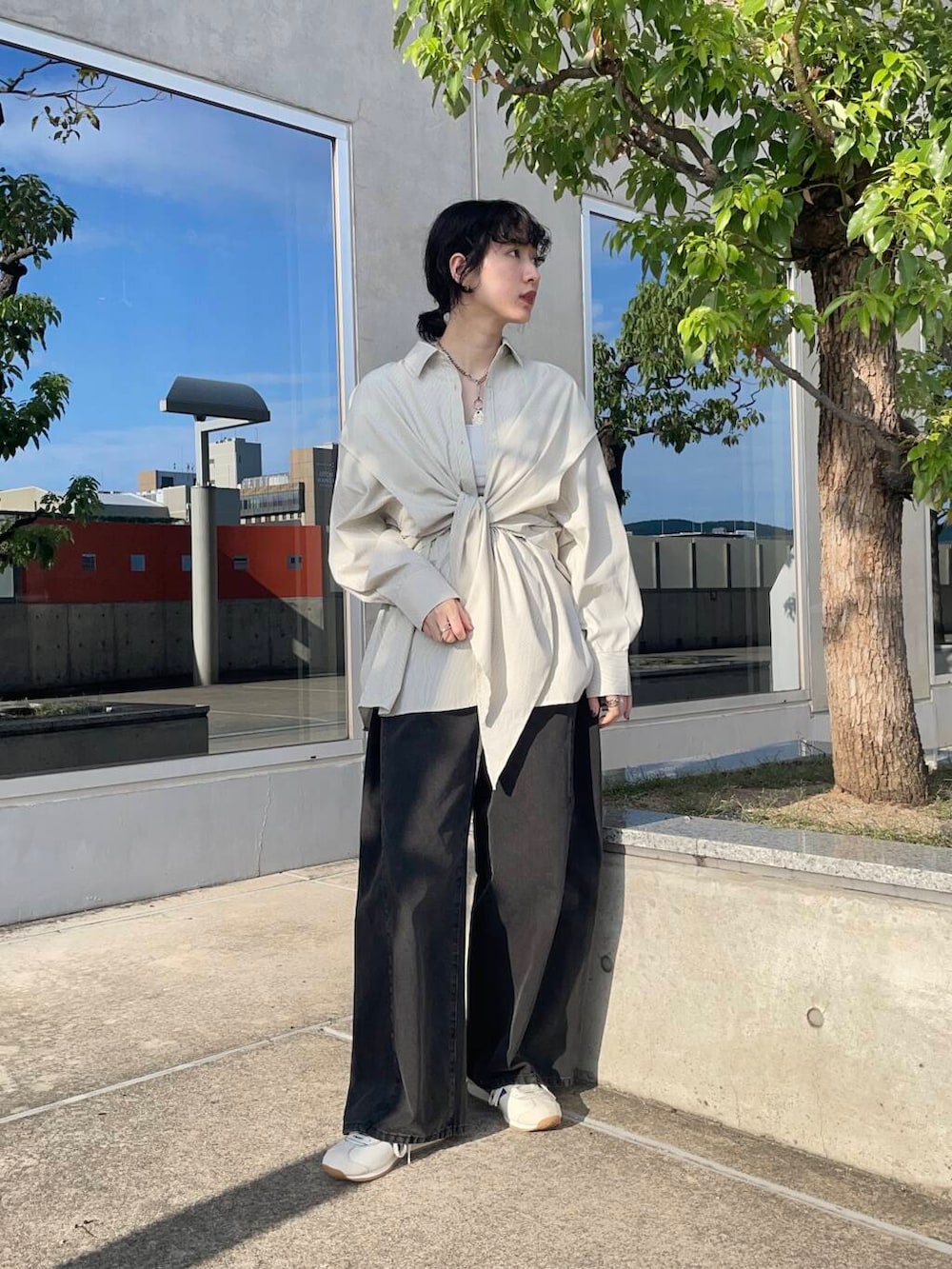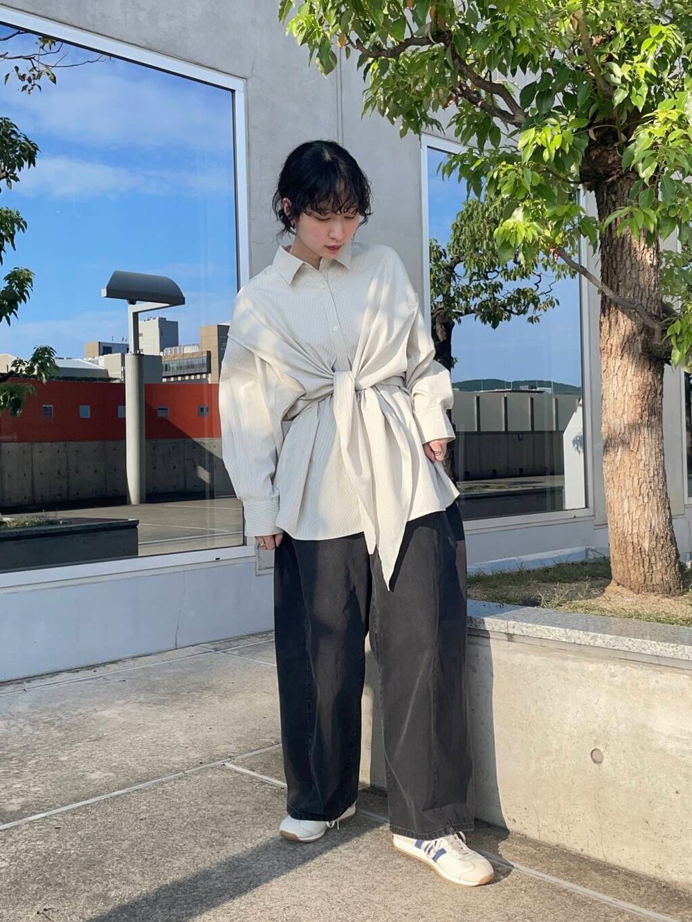 とてもオーバーなサイズ感ですが、前で結ぶとメリハリが出せるようになっています!