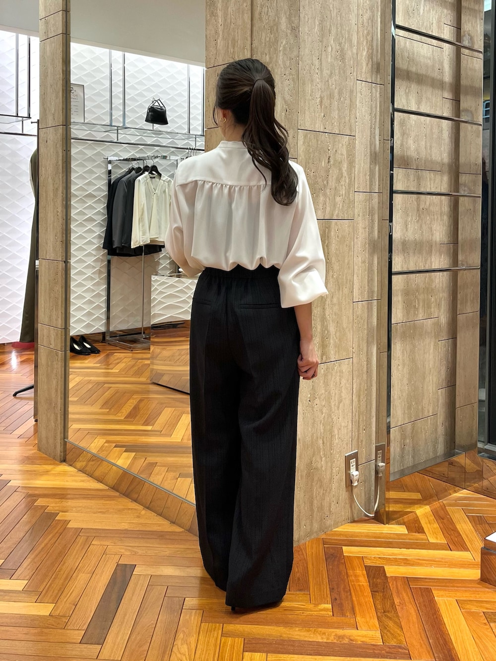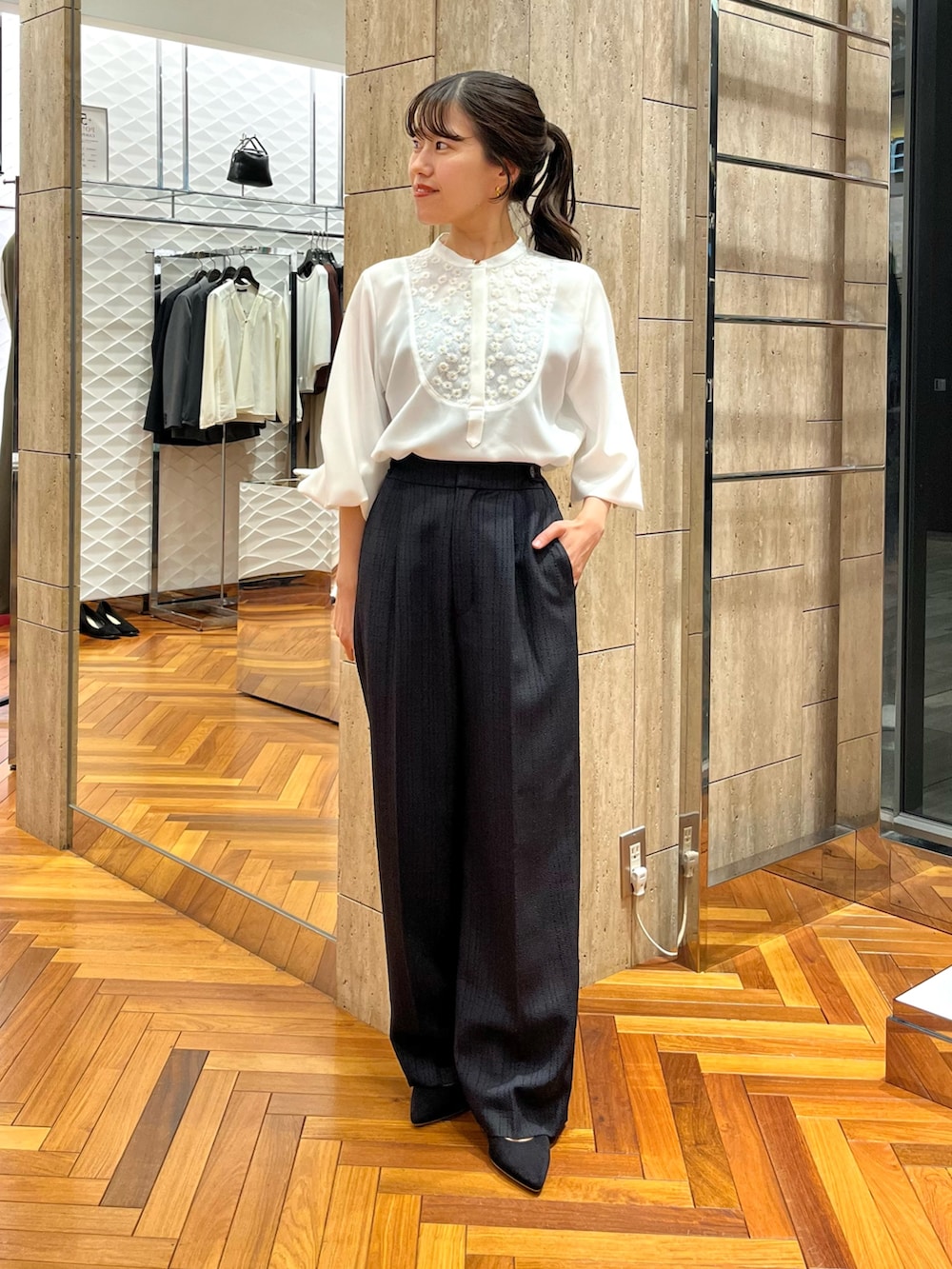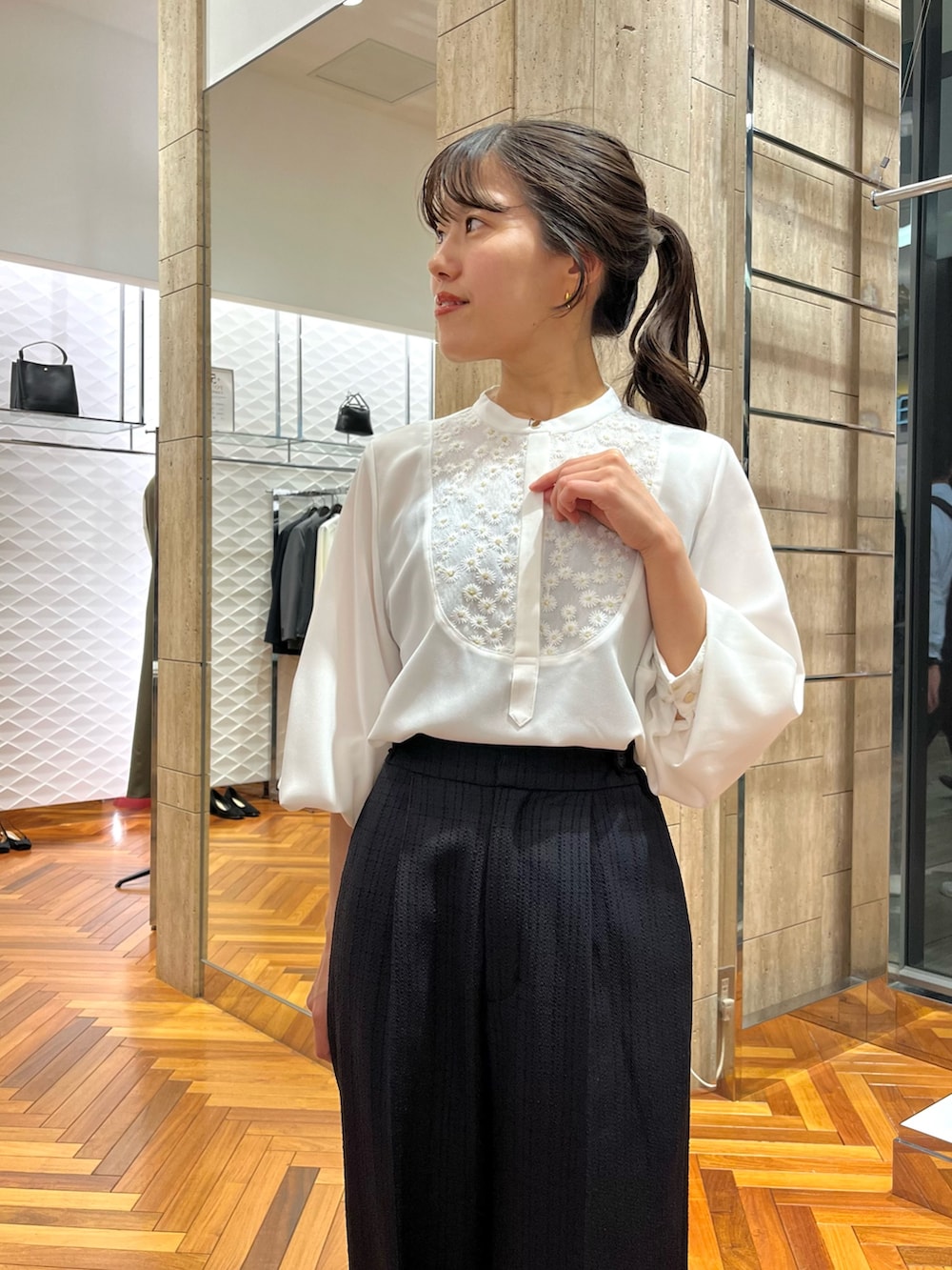 胸元と袖にさりげなく施されているので甘くなりすぎず着用していただけますよ♪