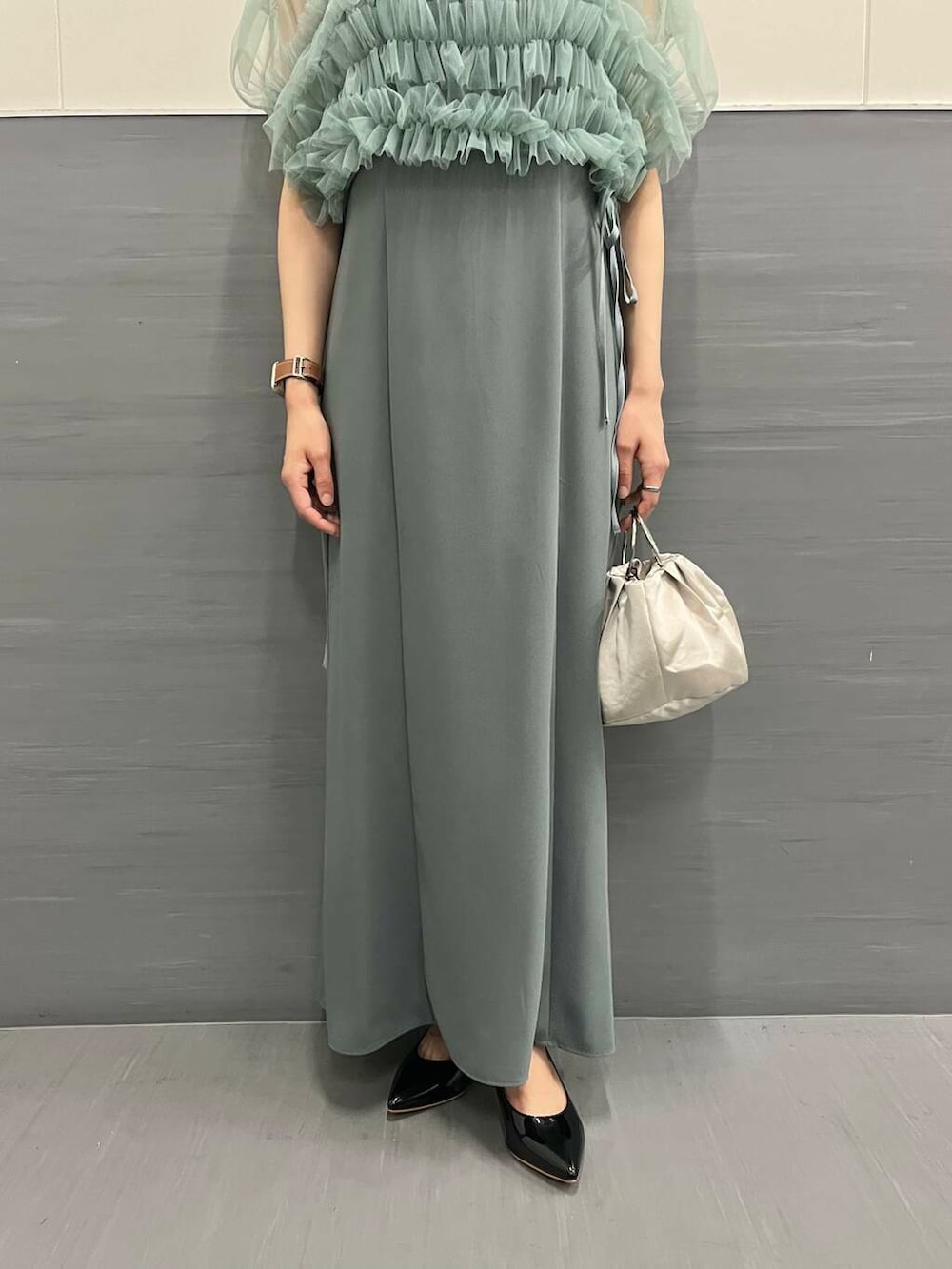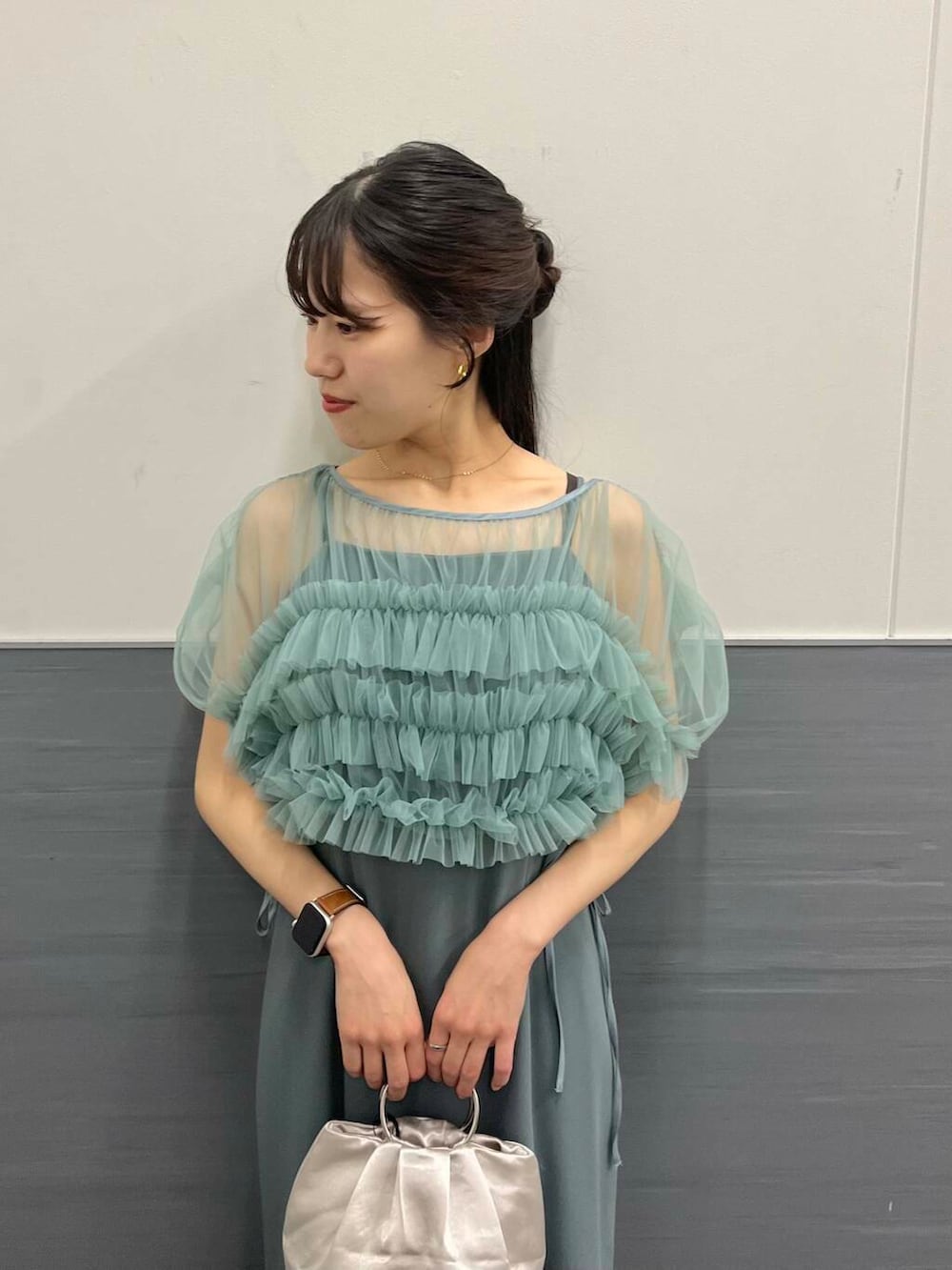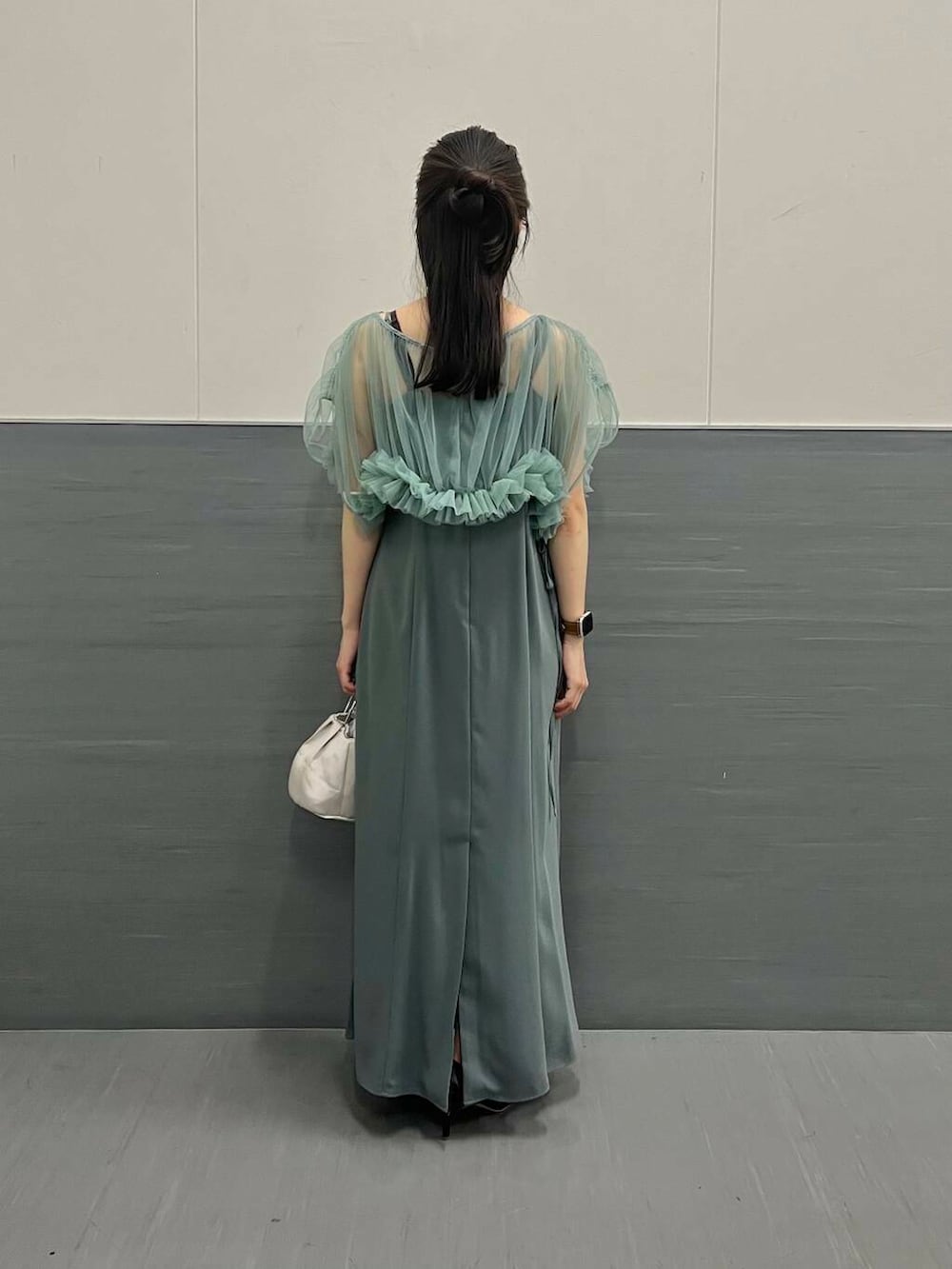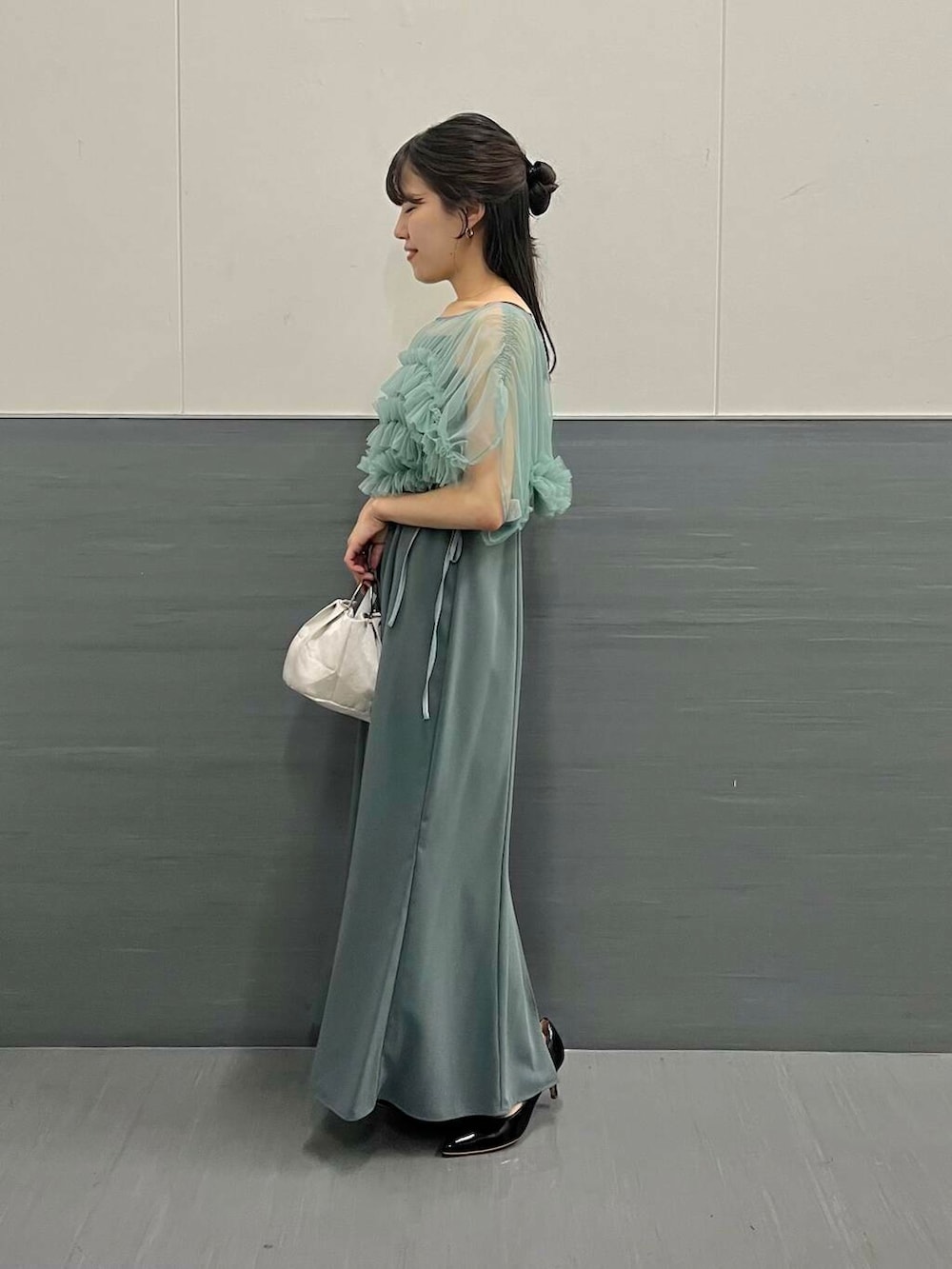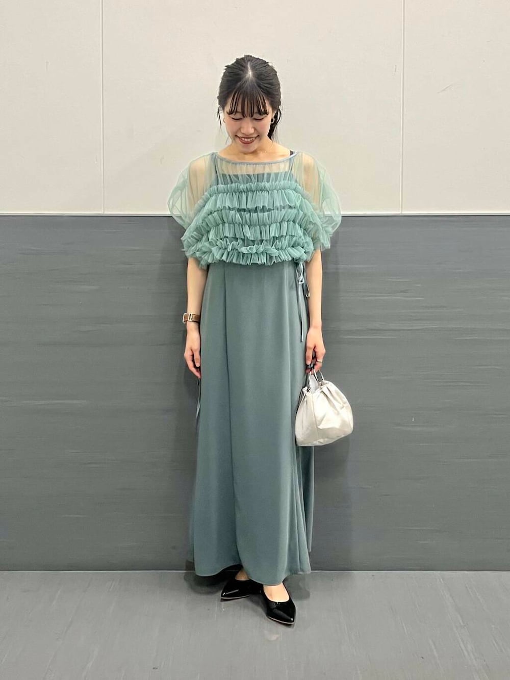 胸元のチュールフリルがとっても素敵なドレスです!ウエスト部分が調節可能なのでお好みのサイズ感で◎