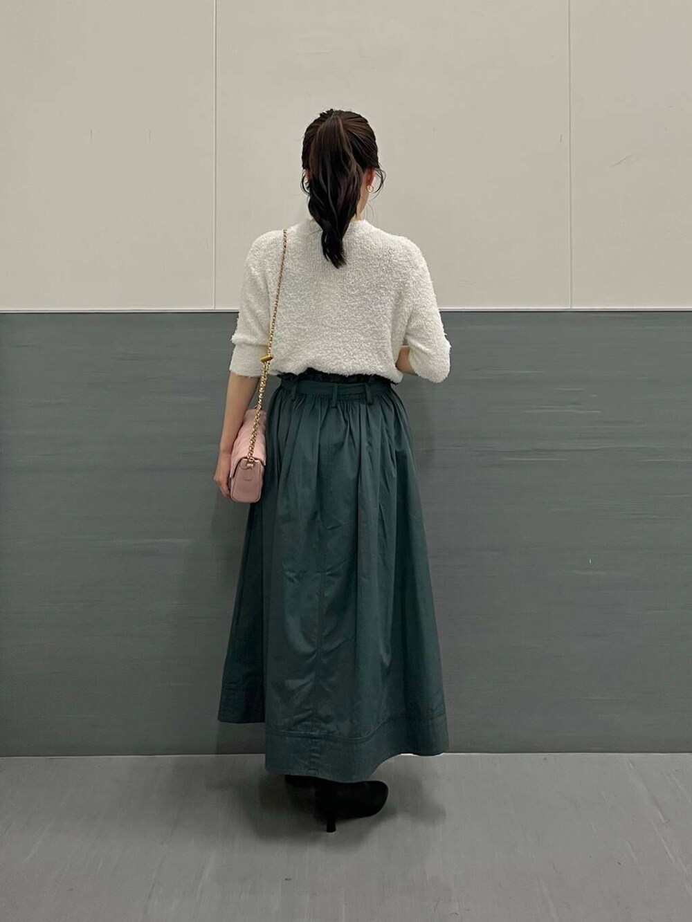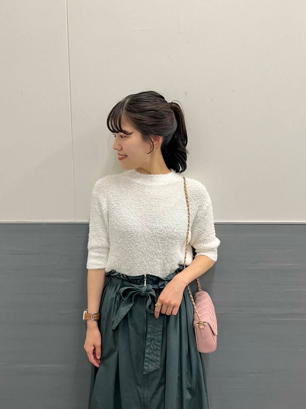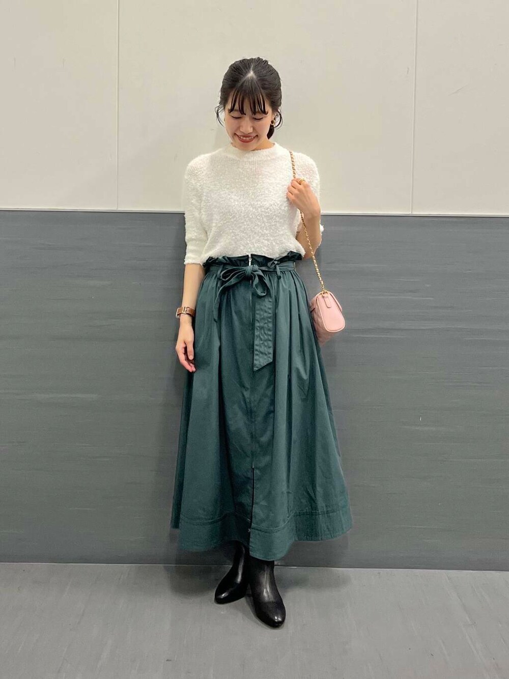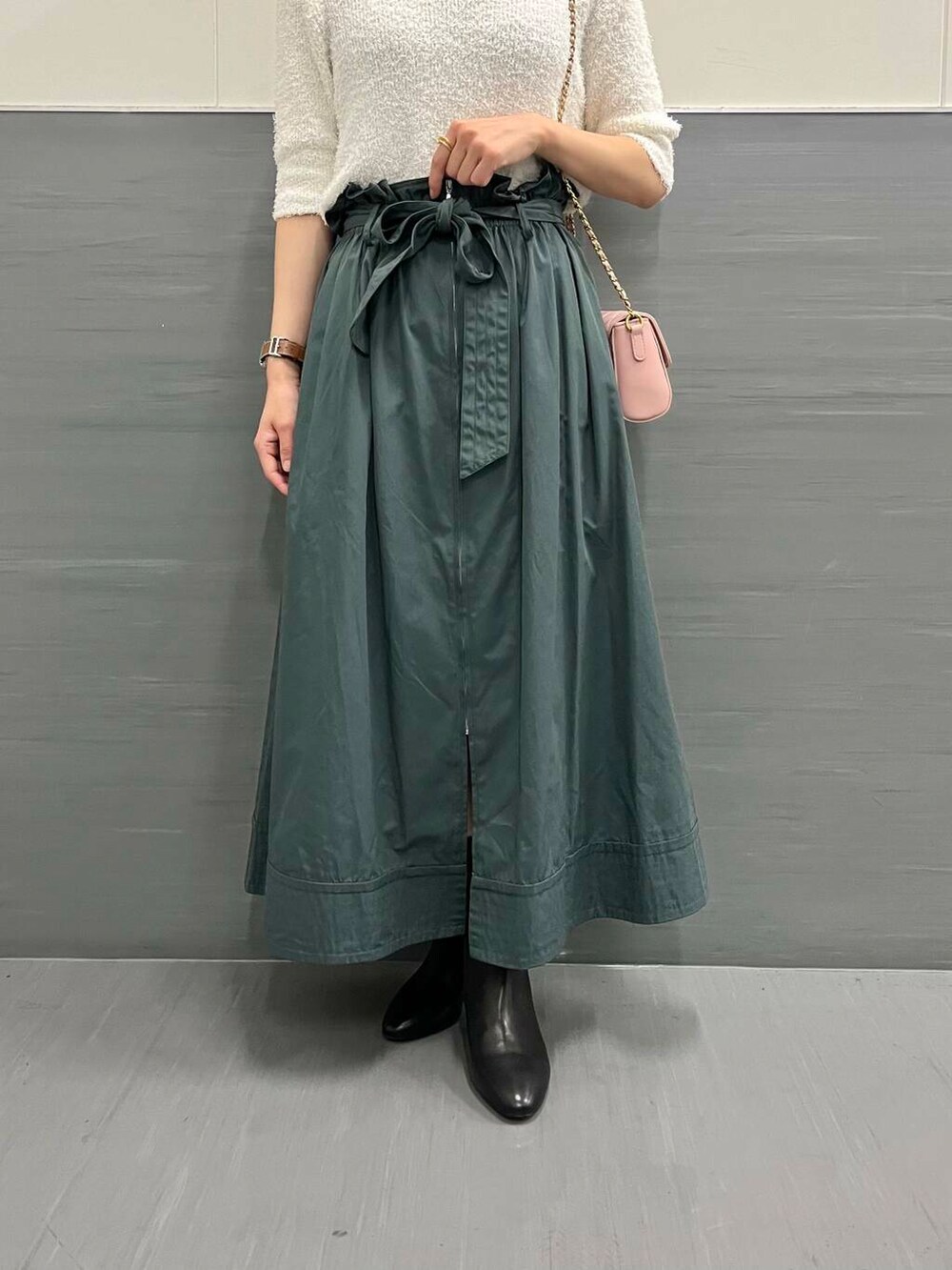 ウエストマークがしっかりあり、ポケット付きで着丈が長すぎないので小柄な方もバランスがとりやすいと思います◎