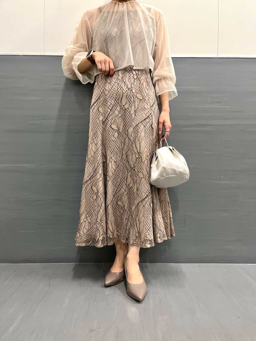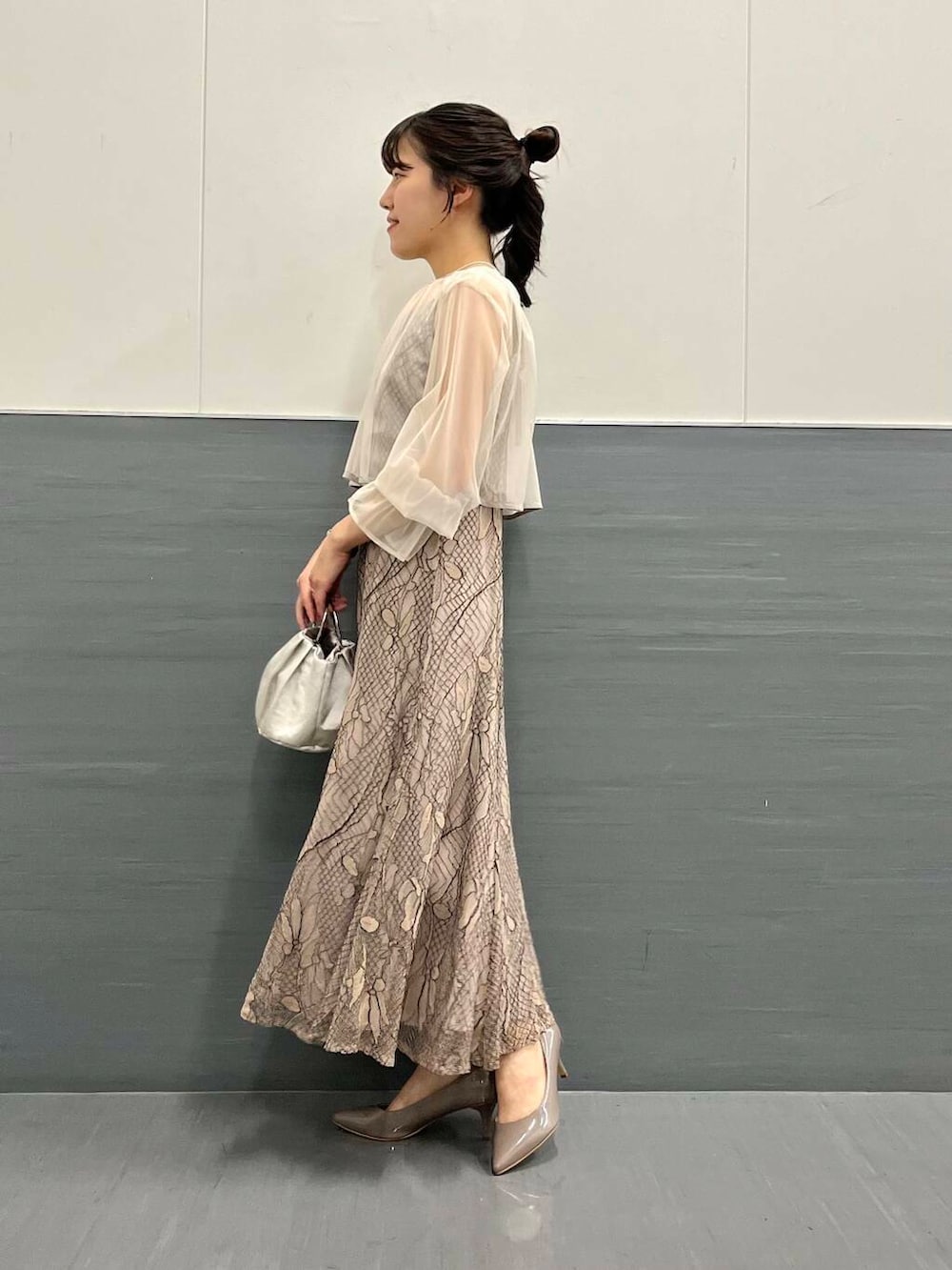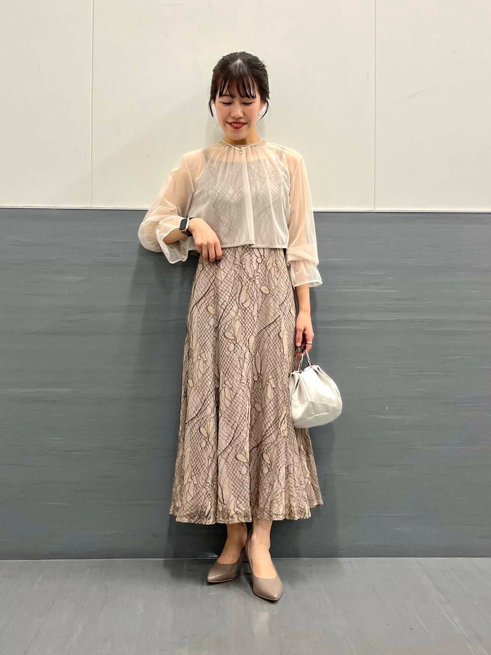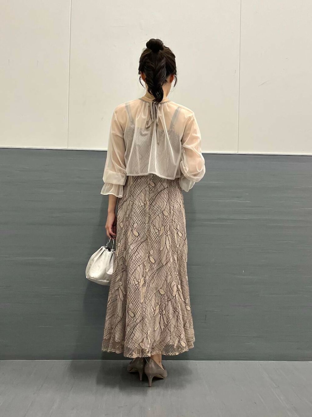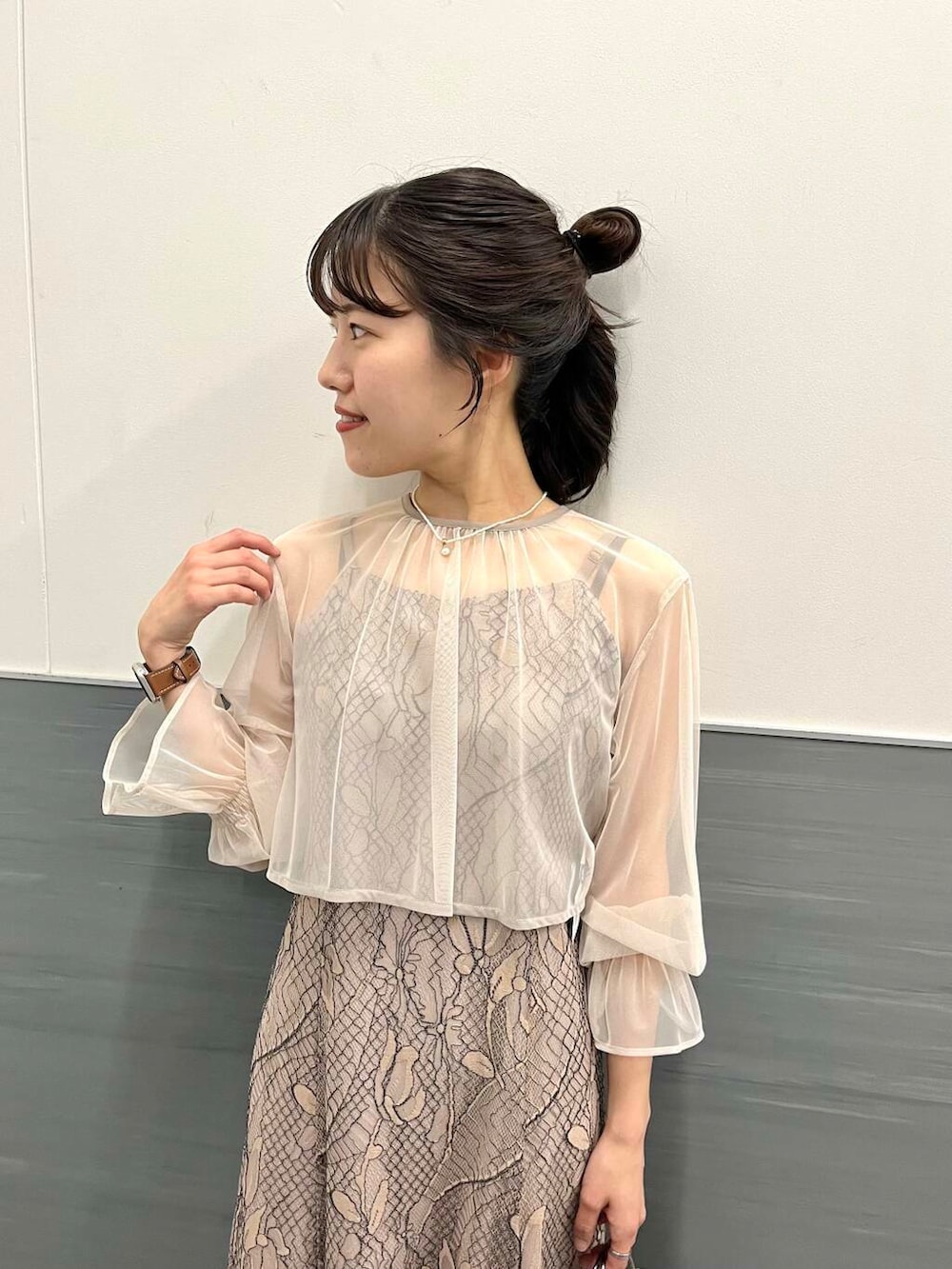 素材感:キャミワンピースは総レース素材で、ボレロ部分はシフォン素材で柔らかいです。