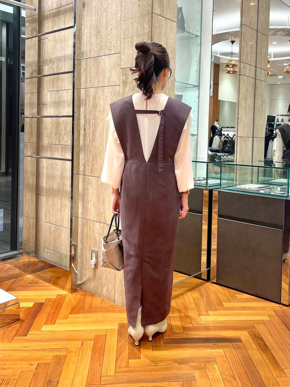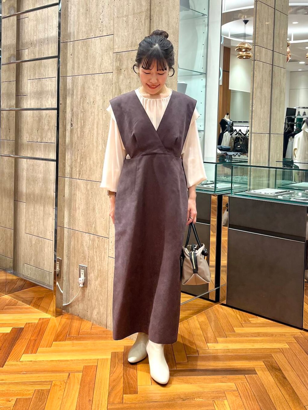 インナーをブラウスにするだけで、フォーマルに。カットソーやニットなどで合わせると普段使いにも使える万能なワンピースです♪