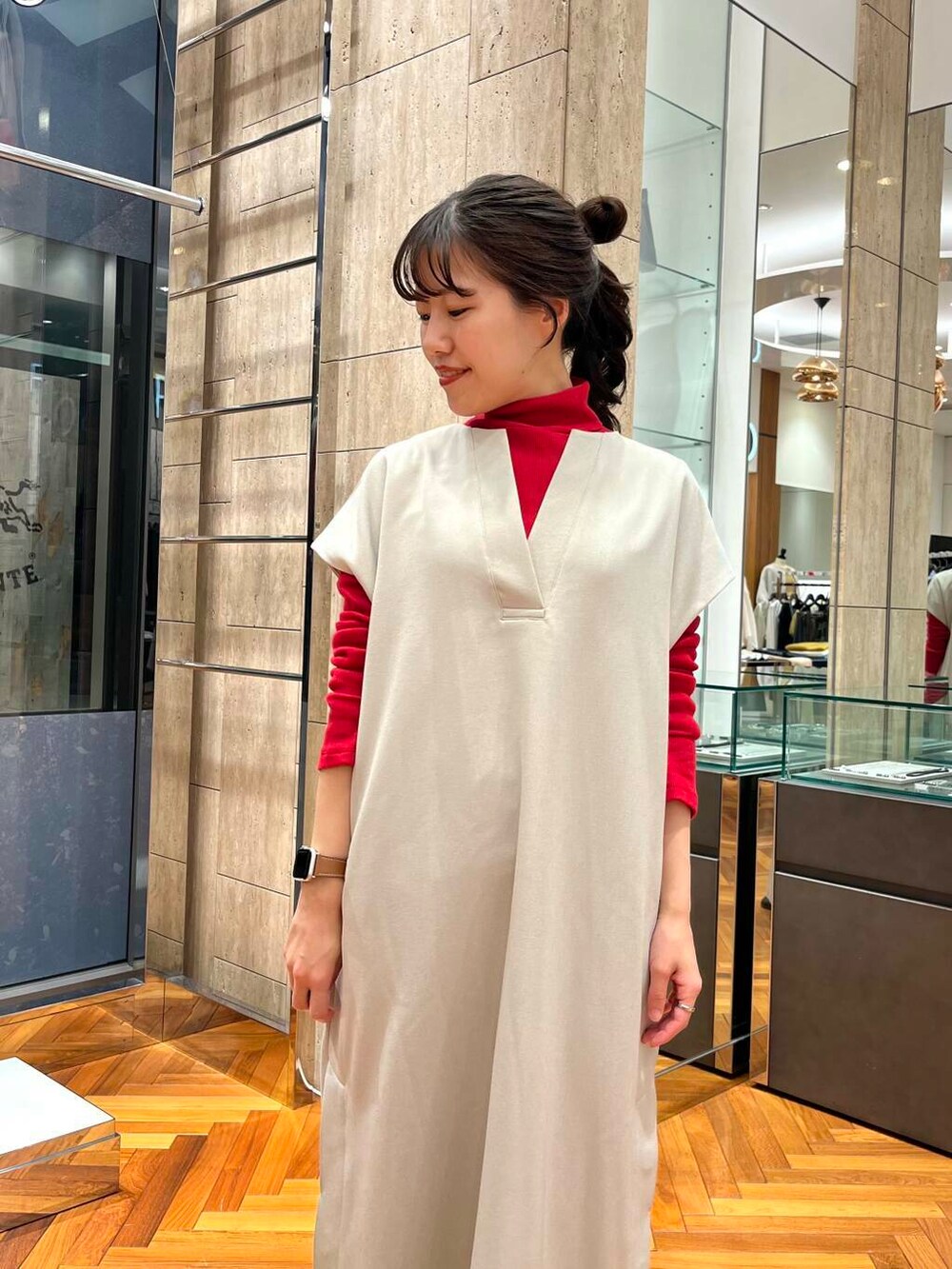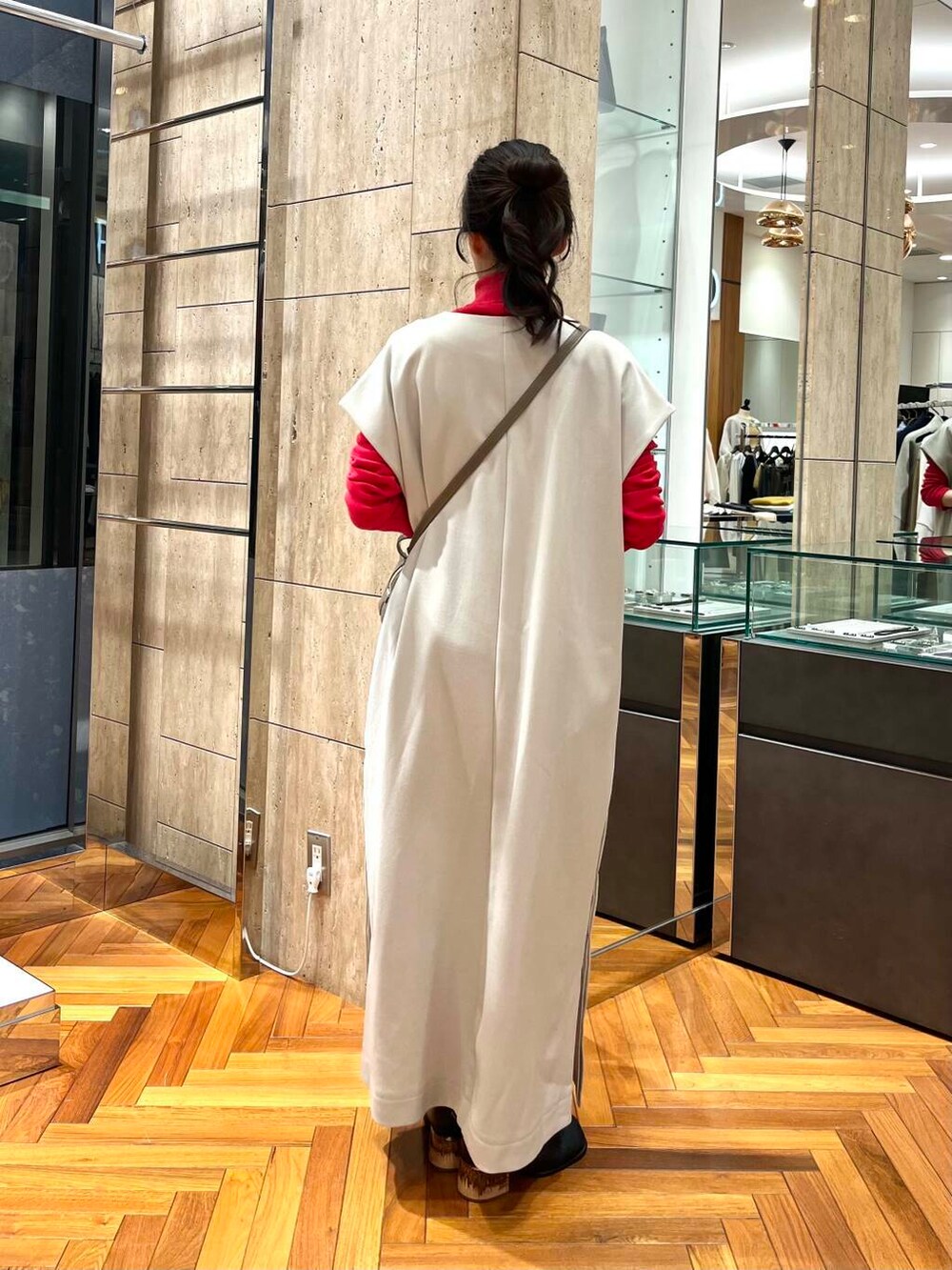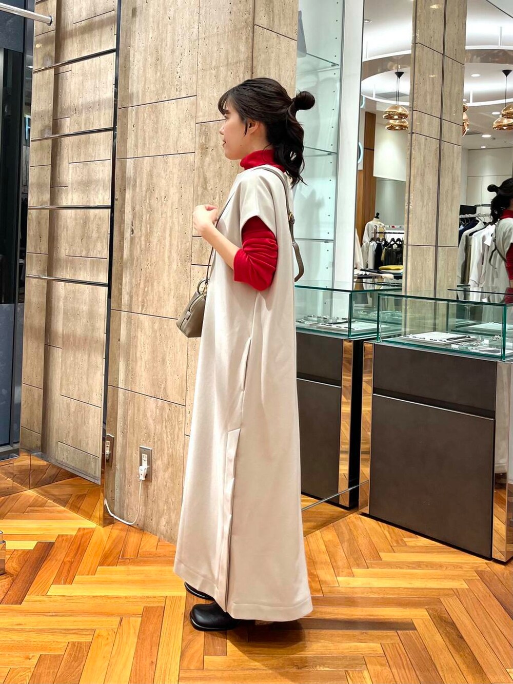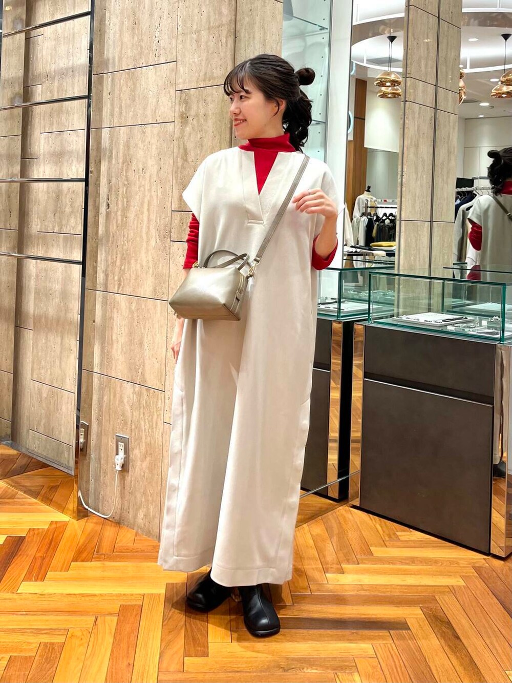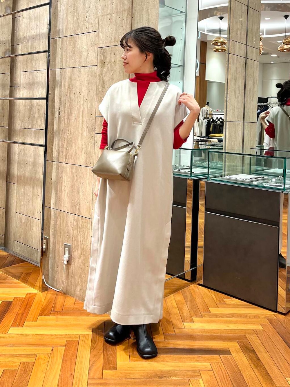 クリスマスを想像させるような赤を差し色に、ゆったり着用できるワンピースで楽に!おしゃれに!着こなせるコーディネートに♪