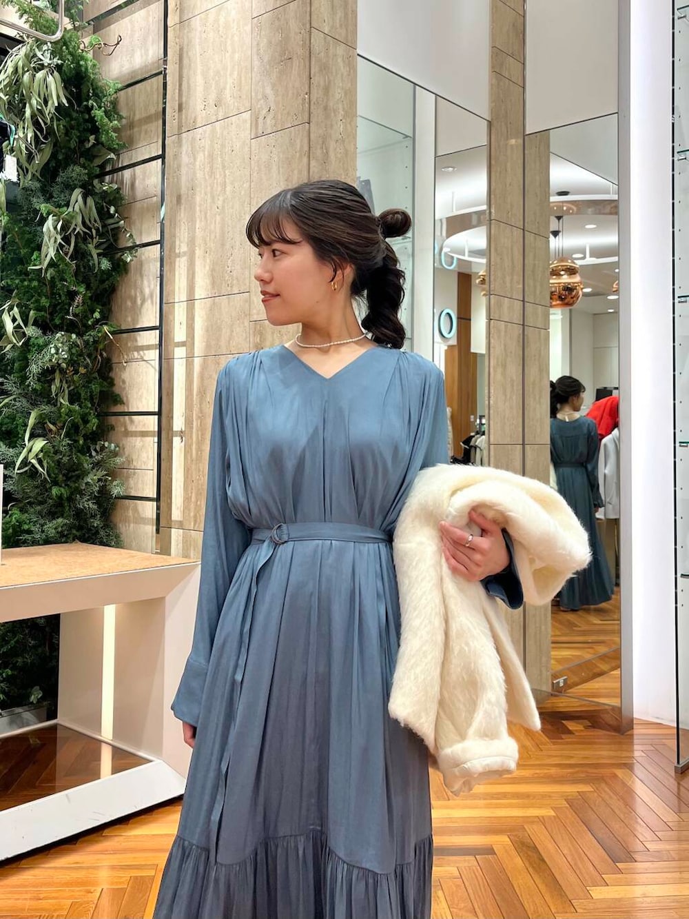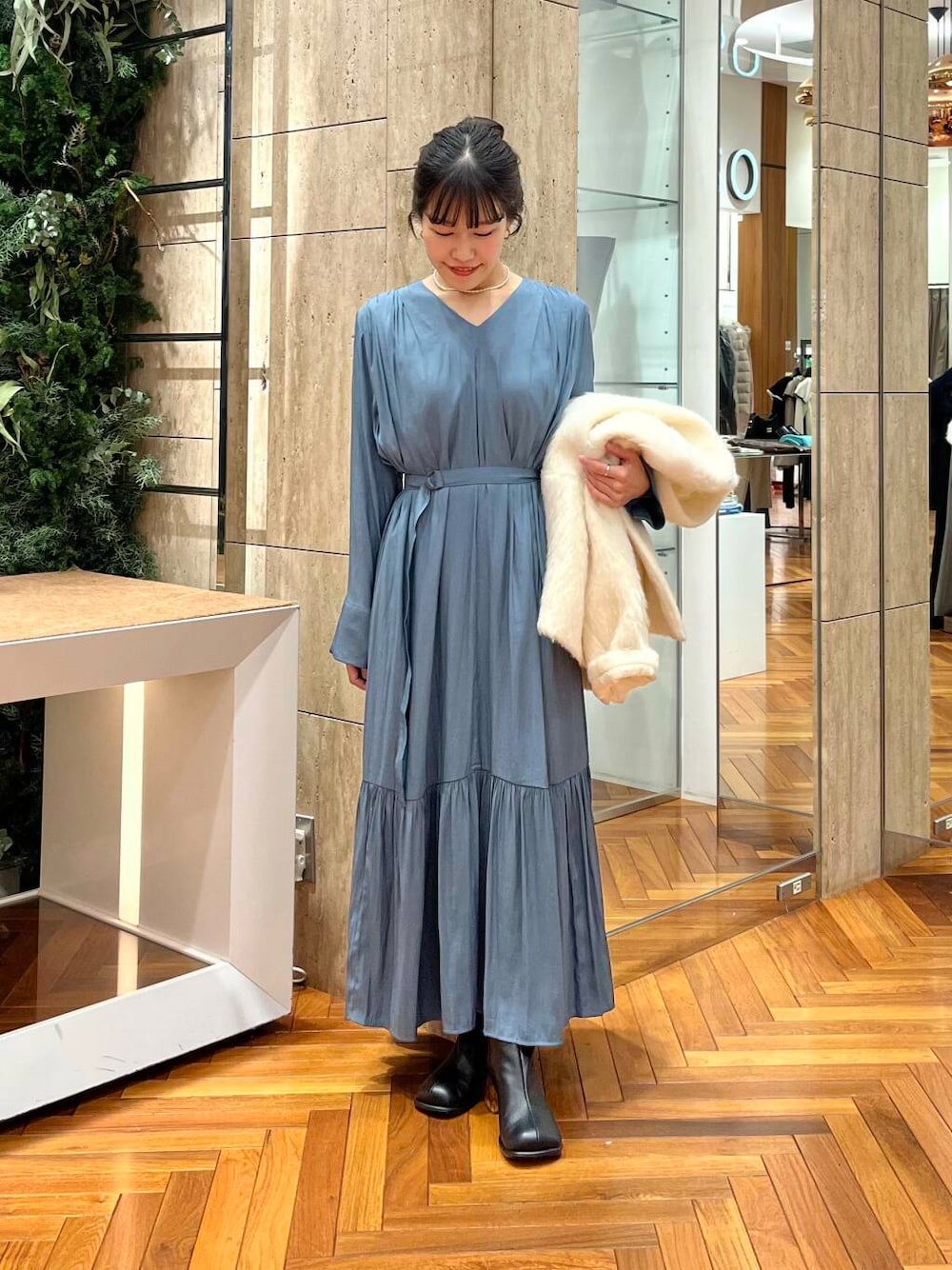 とろみのあるワンピース、裾フレアなデザインがポイントで、ウエストマークは自由にできます◎