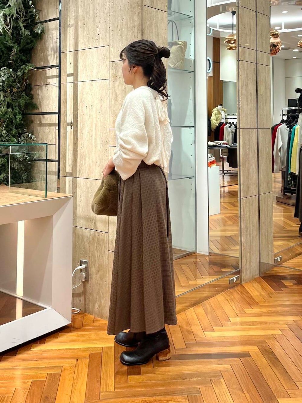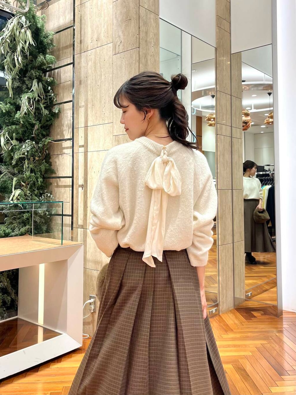 バックリボンが可愛いニットに、チェック柄スカートを合わせて大人フェミニンなコーディネートに♪