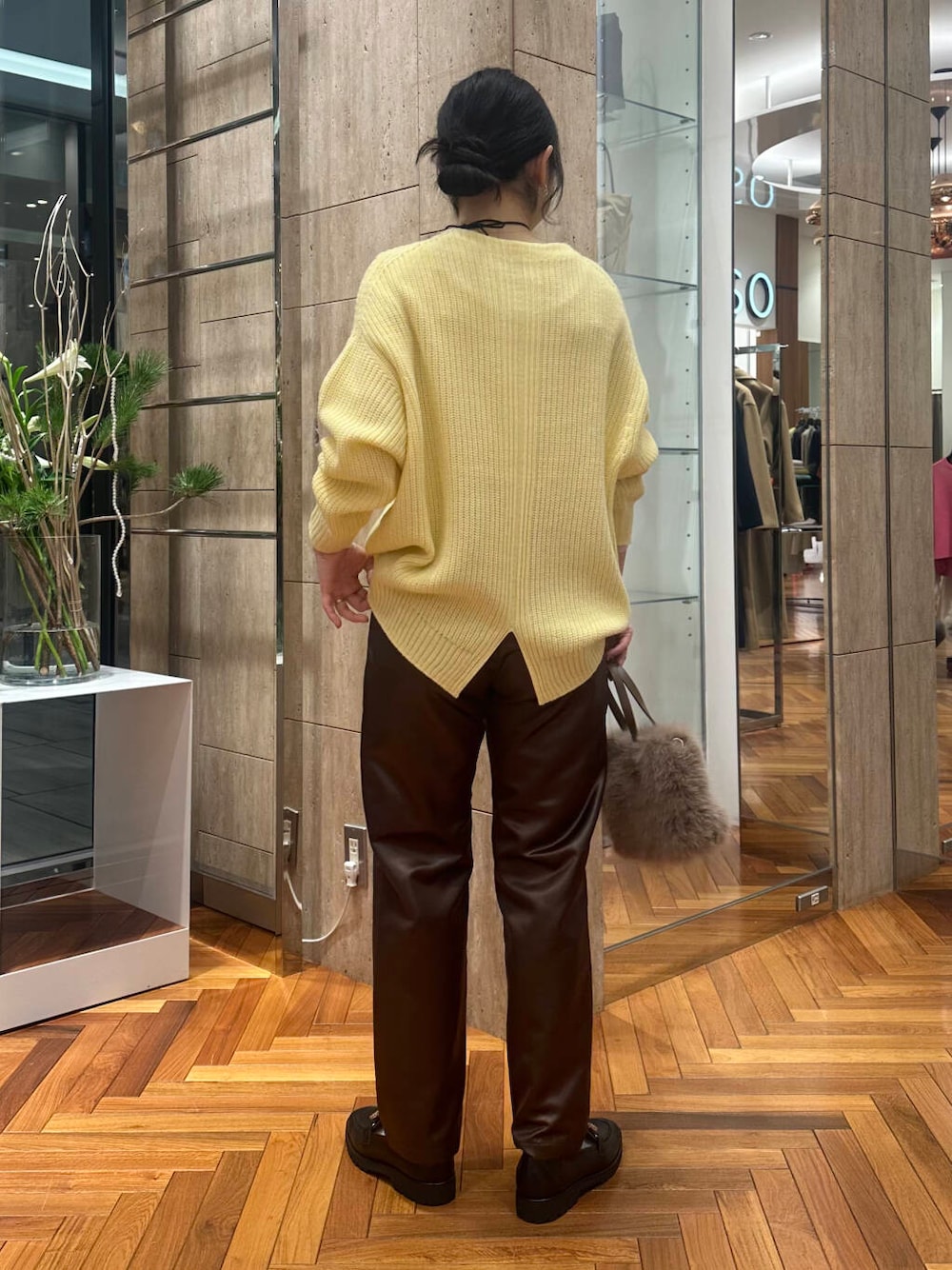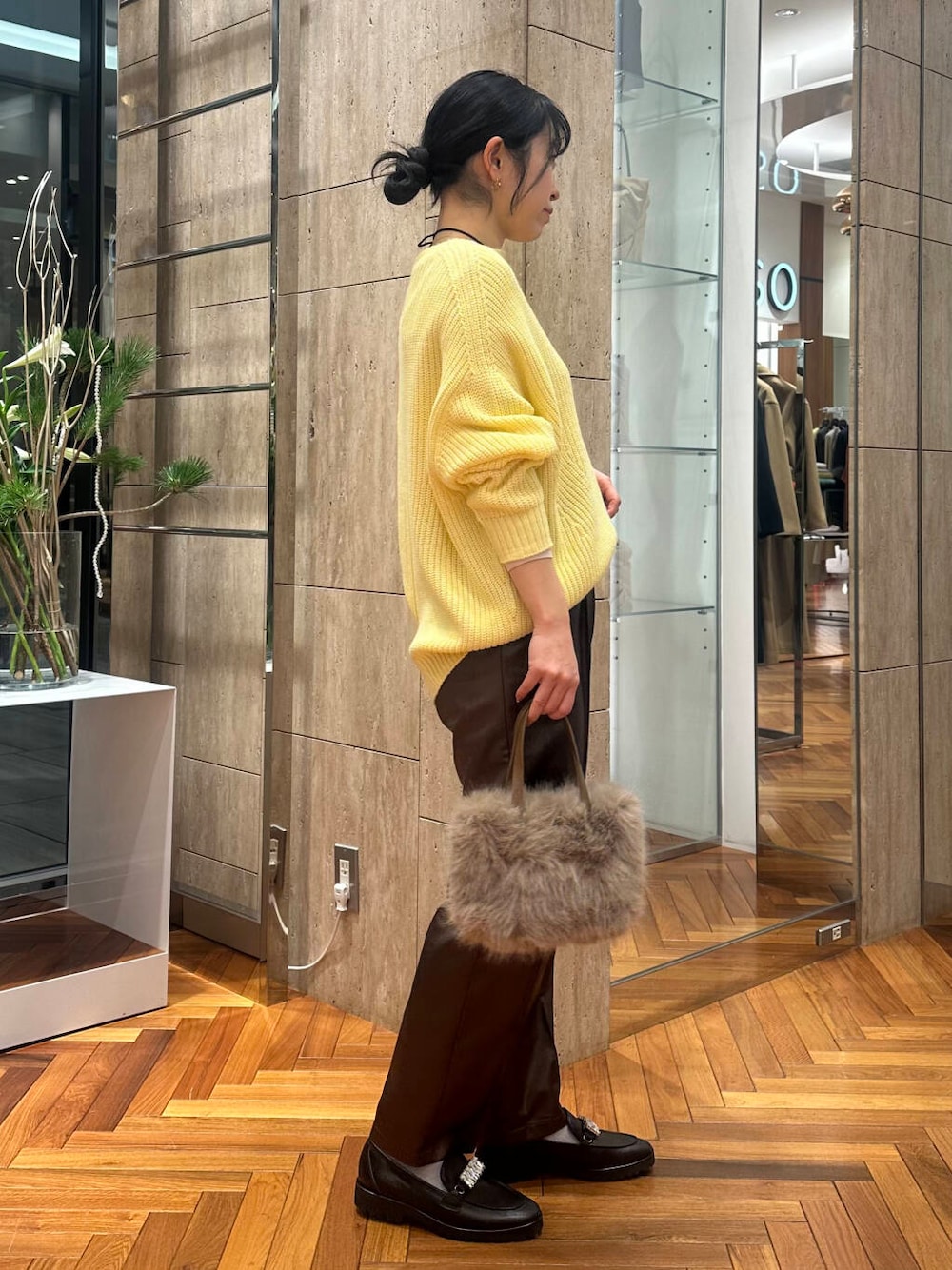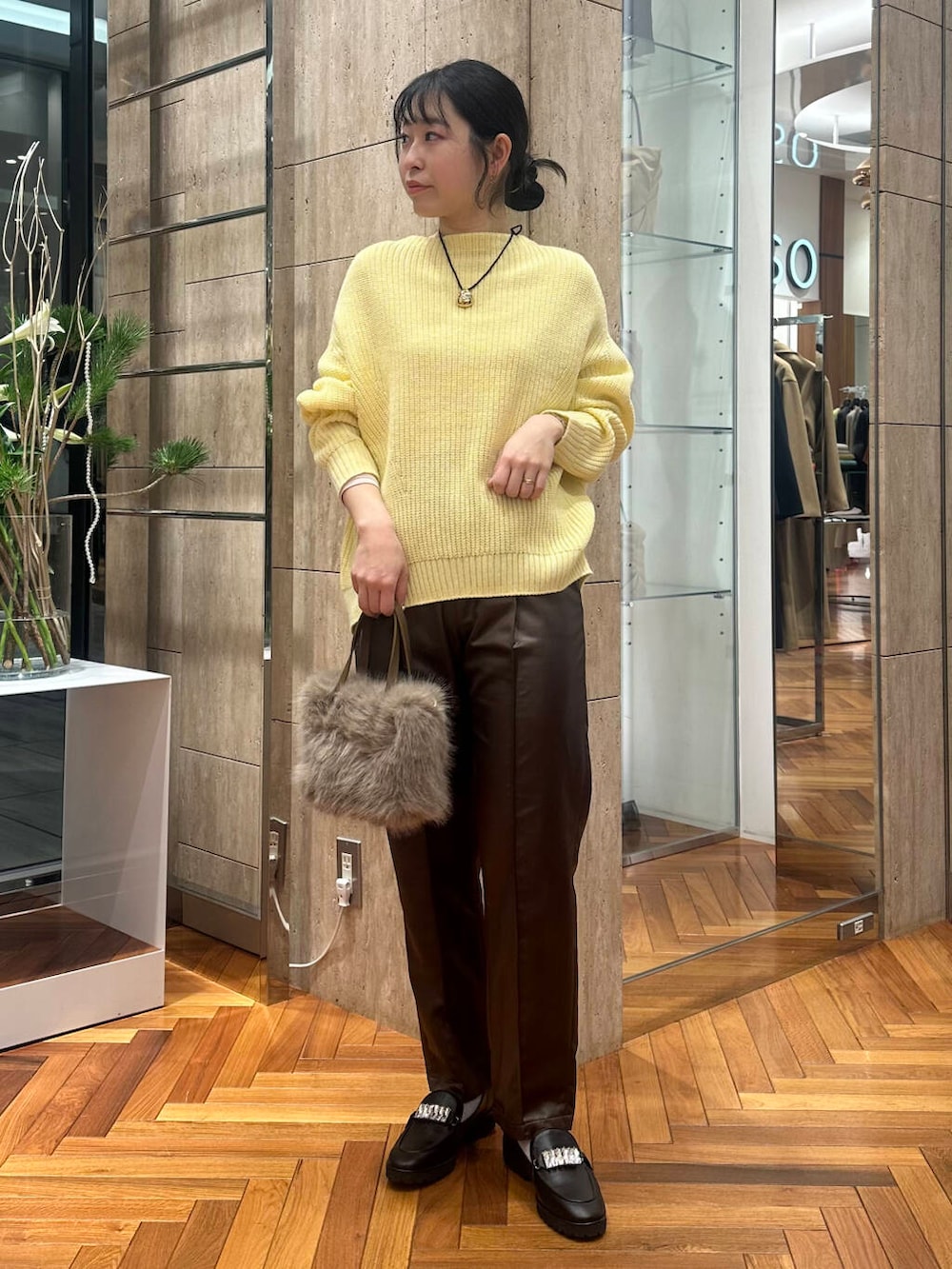 イエローの可愛らしさを辛口なレザーパンツで
