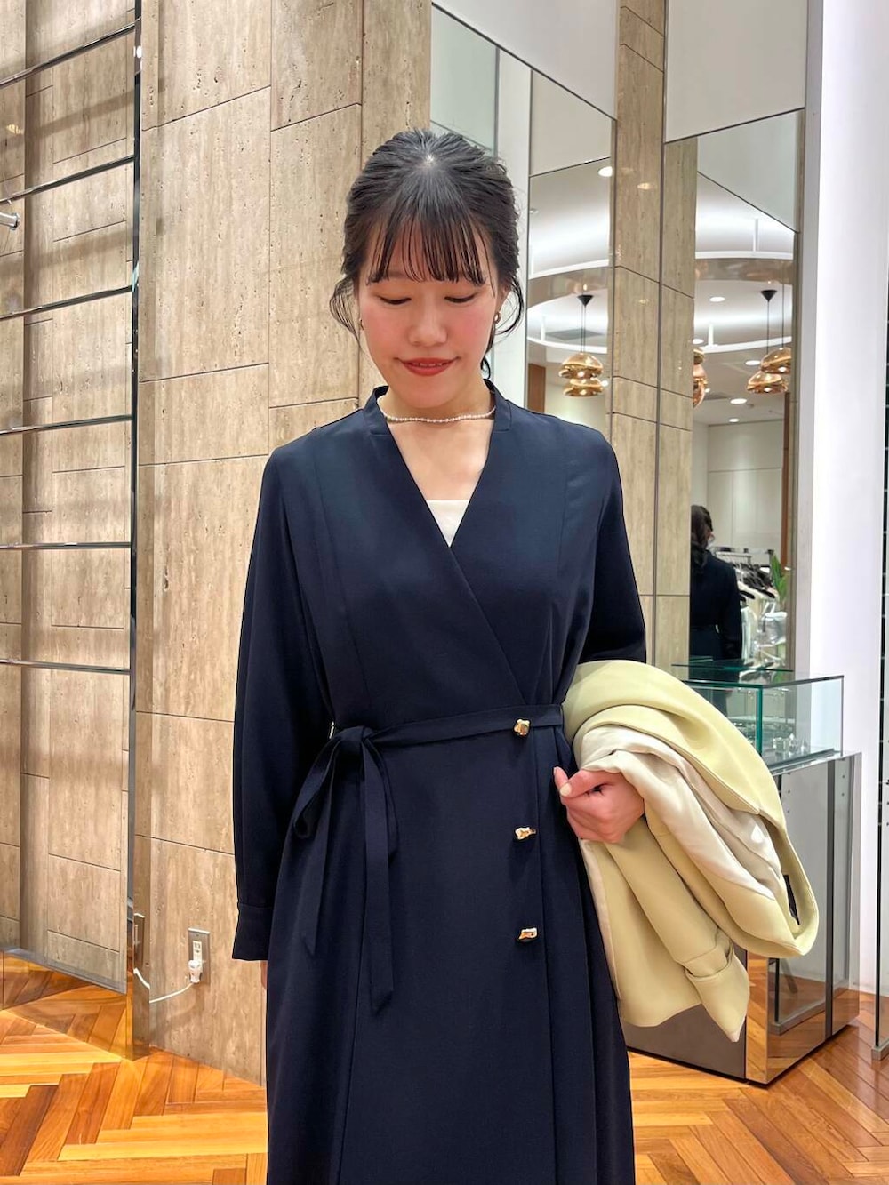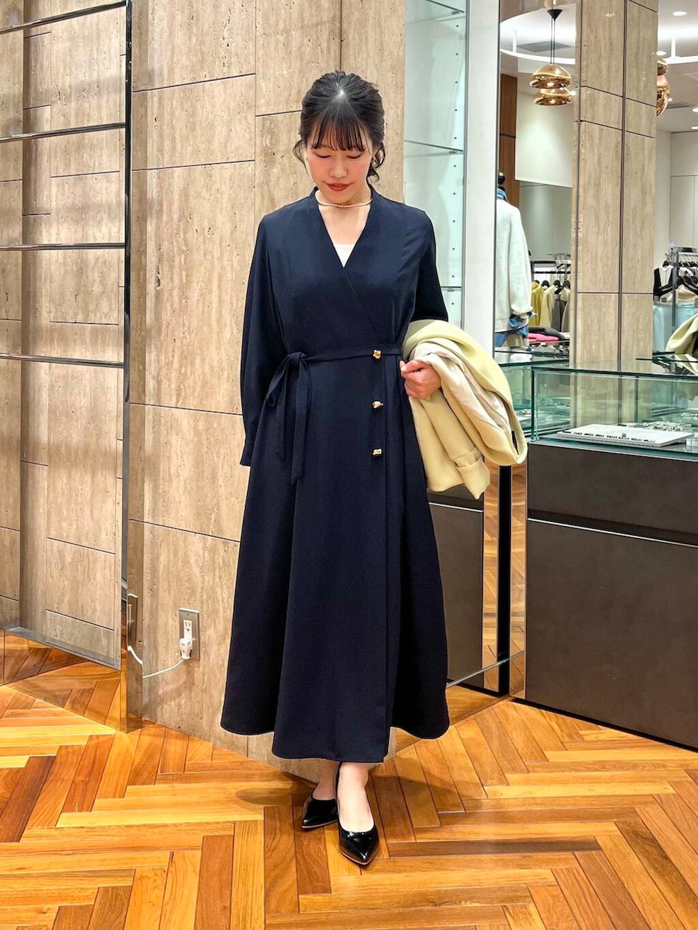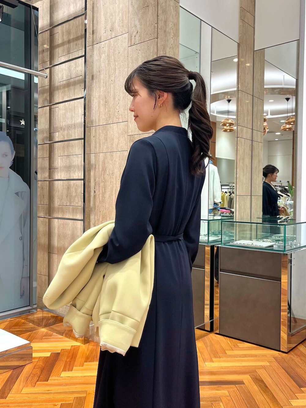 Vネックですっきりし印象に、リボンでウエストマーク、ゴールドボタンで上品見え◎