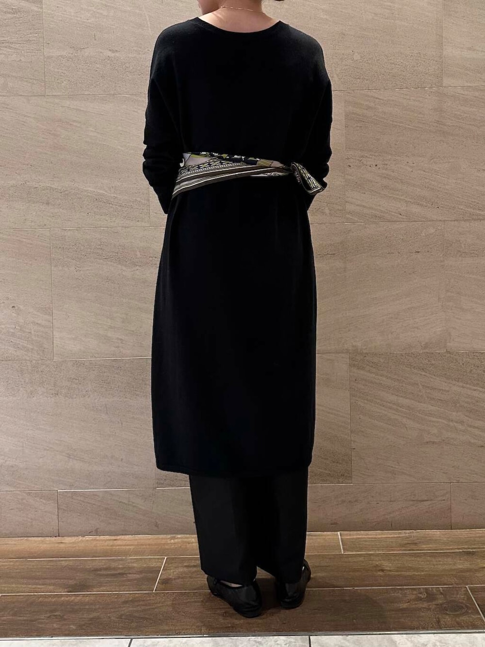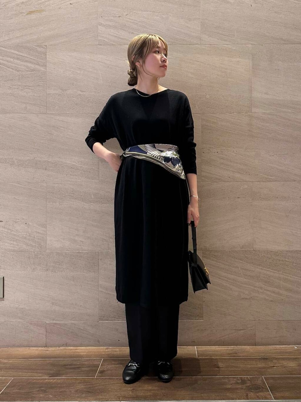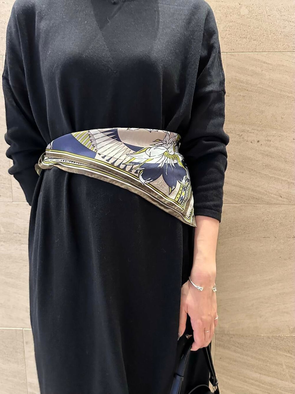 シンプルなデザインなので、スカーフを腰に巻いてウエストマークしたスタイリングにしてみました💡