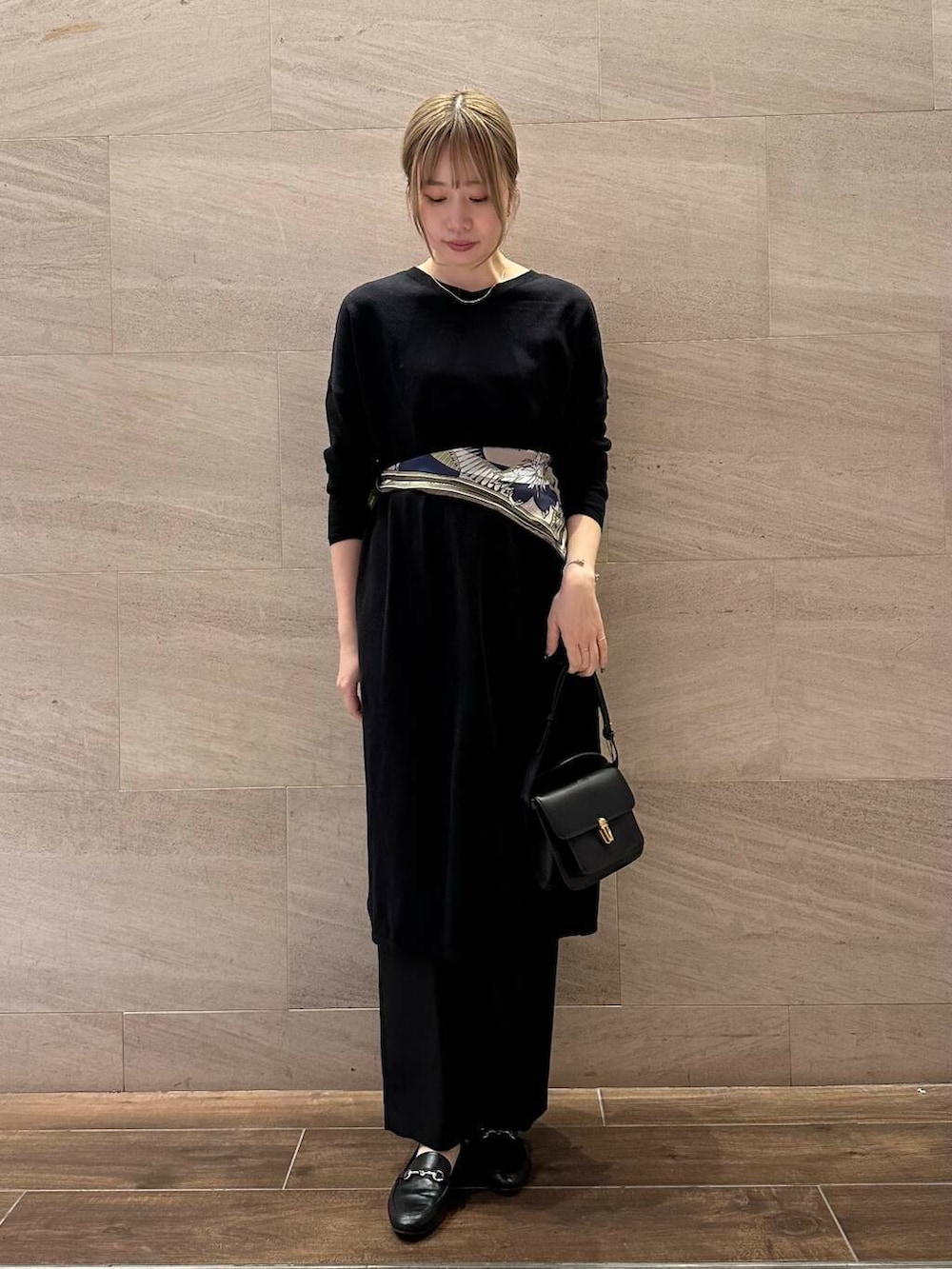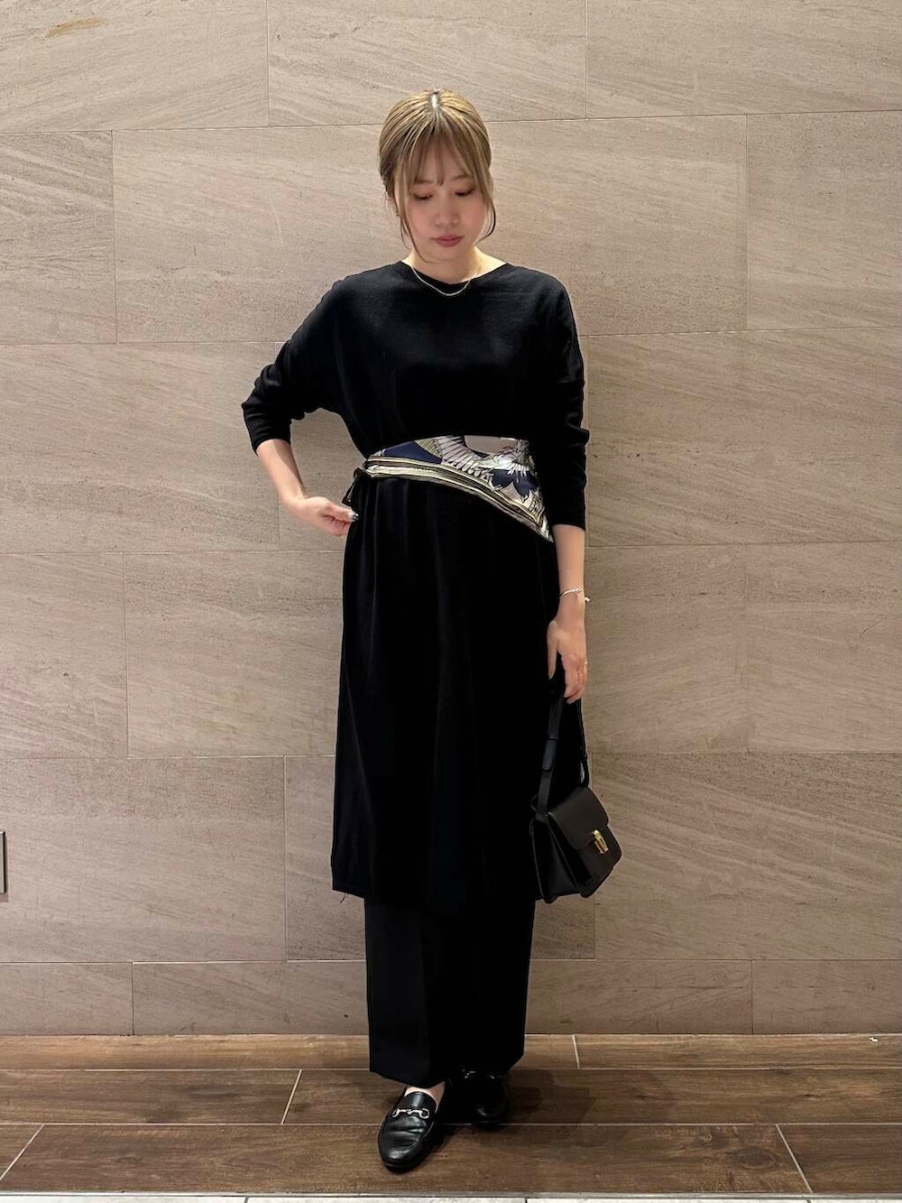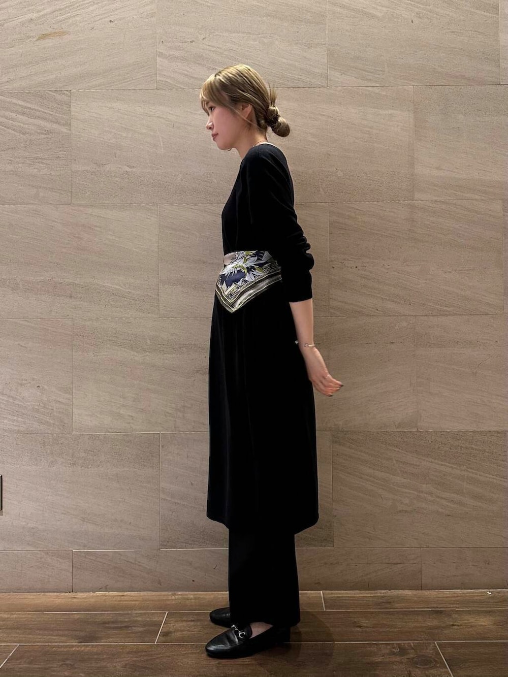 シンプルなデザインなので、スカーフを腰に巻いてウエストマークしたスタイリングにしてみました💡