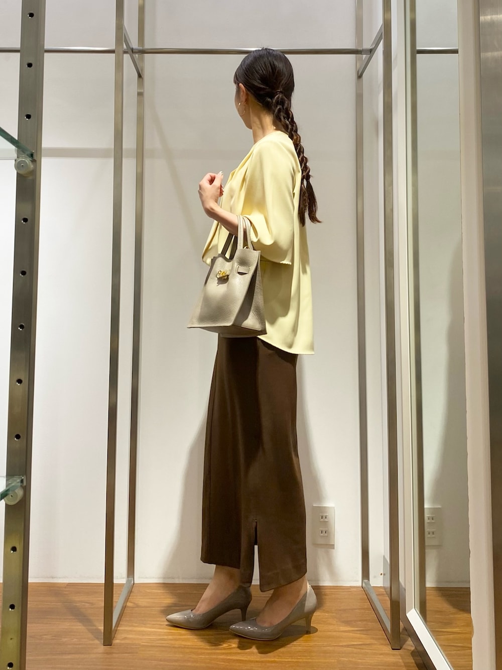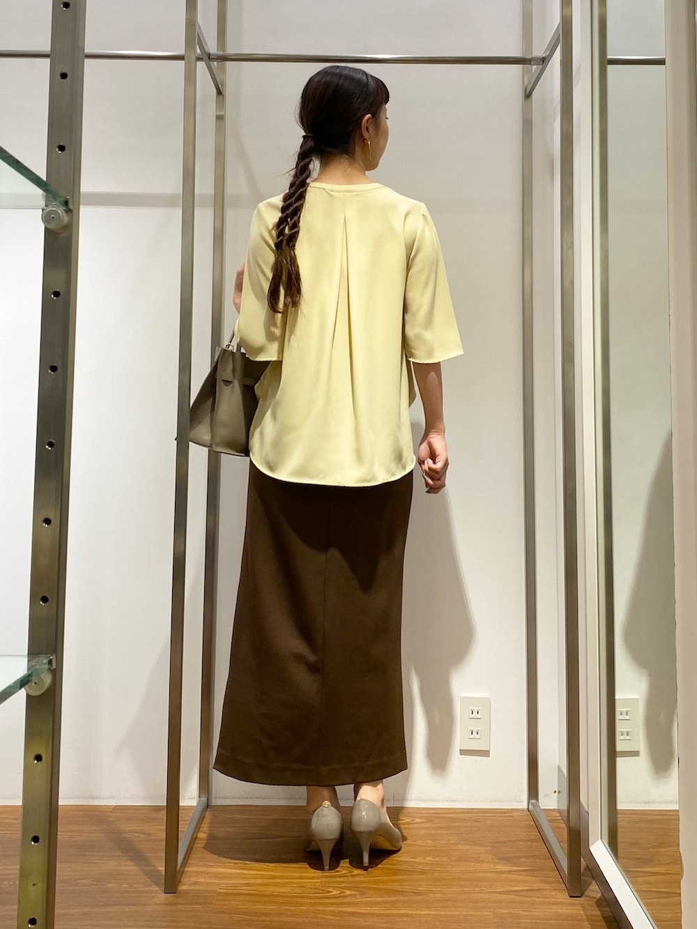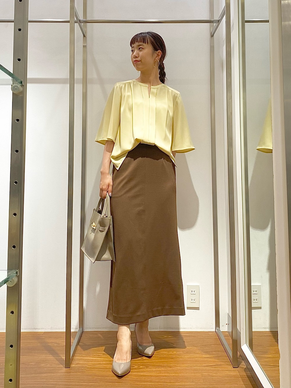 夏ブラウスをブラウンのスカートと合わせて秋イメージでコーディネート。