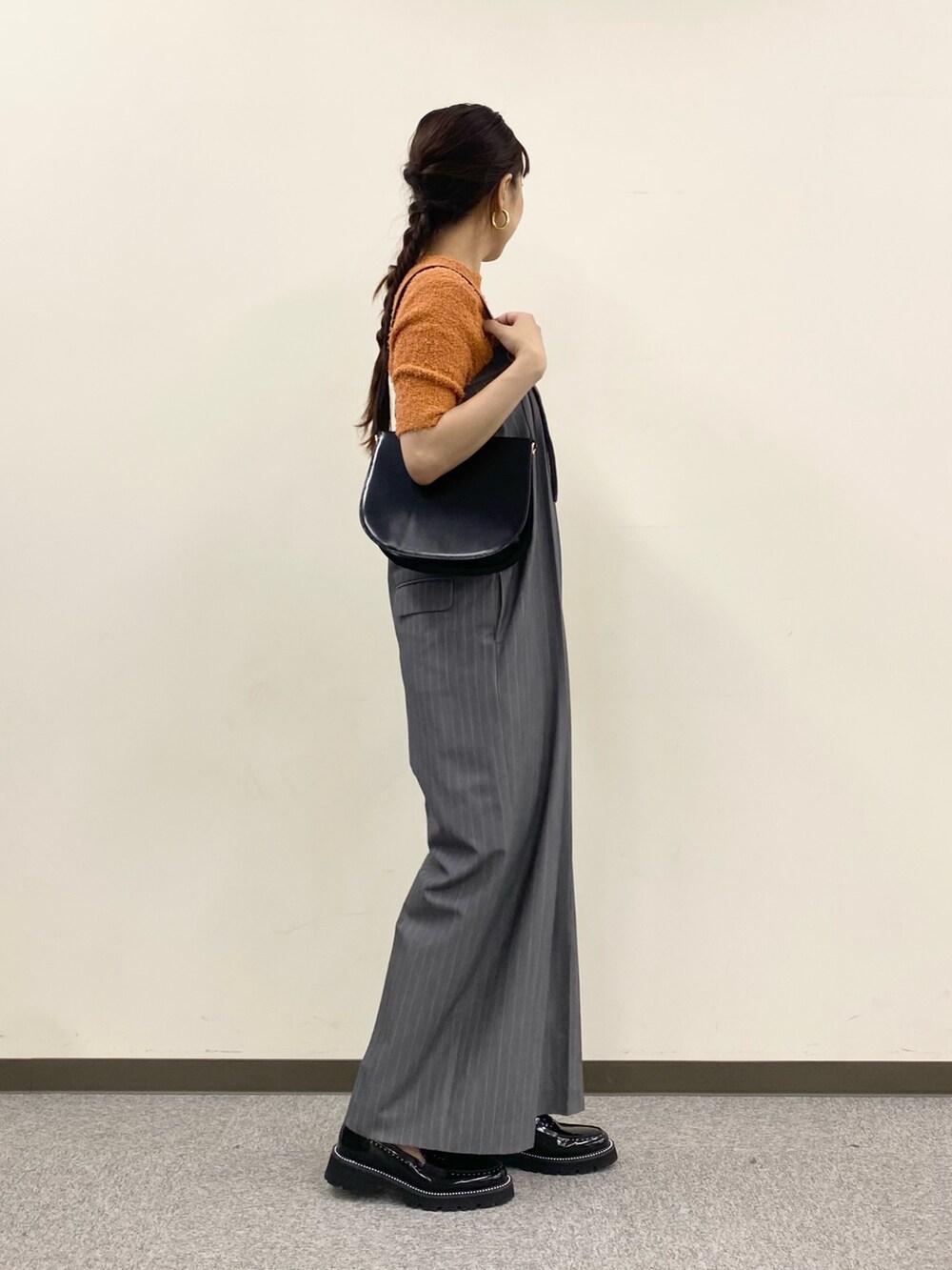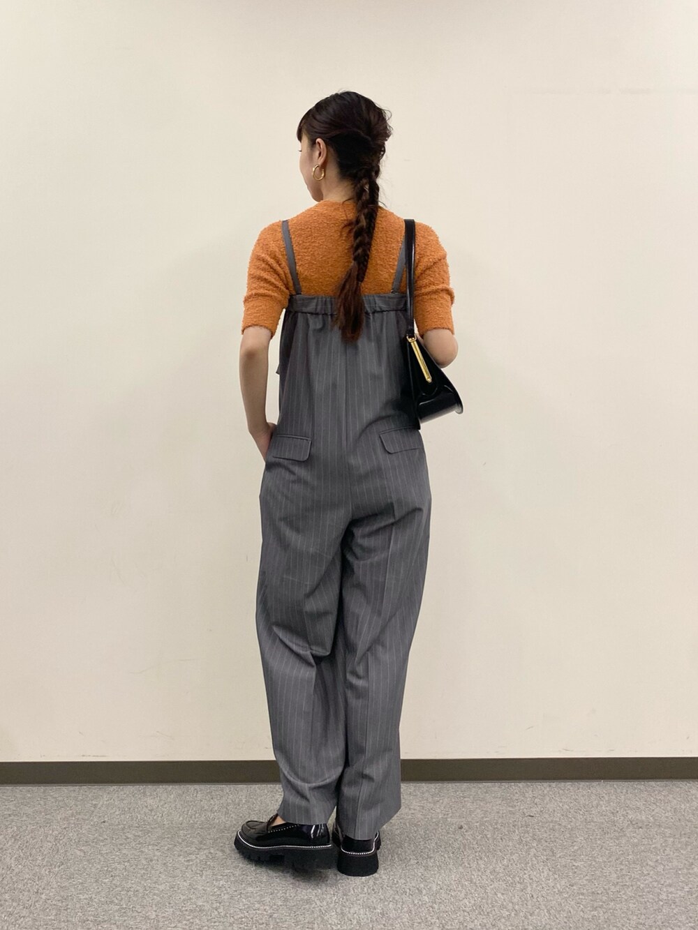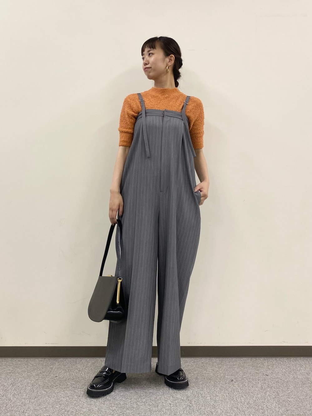 ピンストライプのおかげでぼんやりせずこなれた印象で着れます。