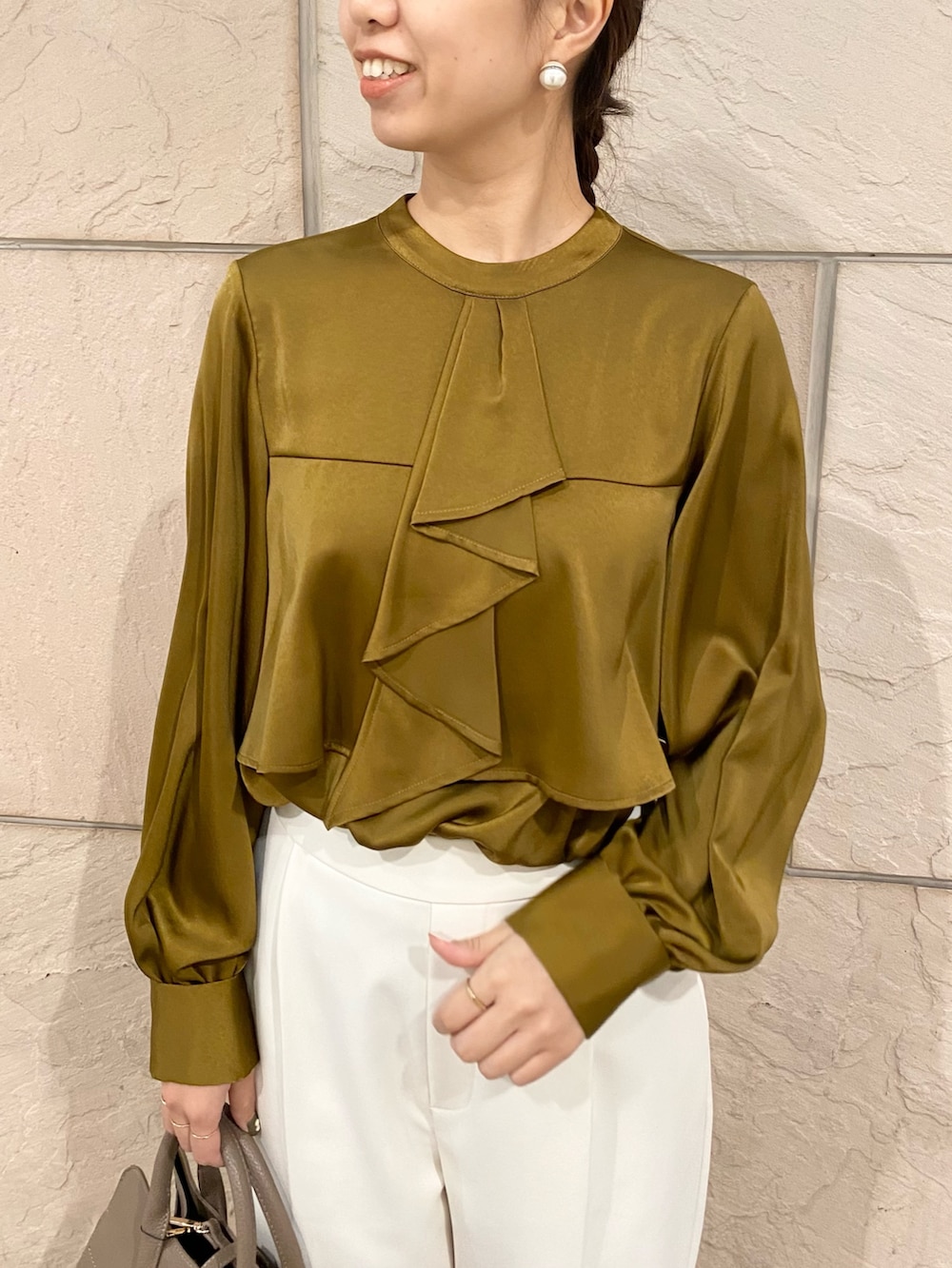 ふんわりフリルが目を引くサテンブラウス!