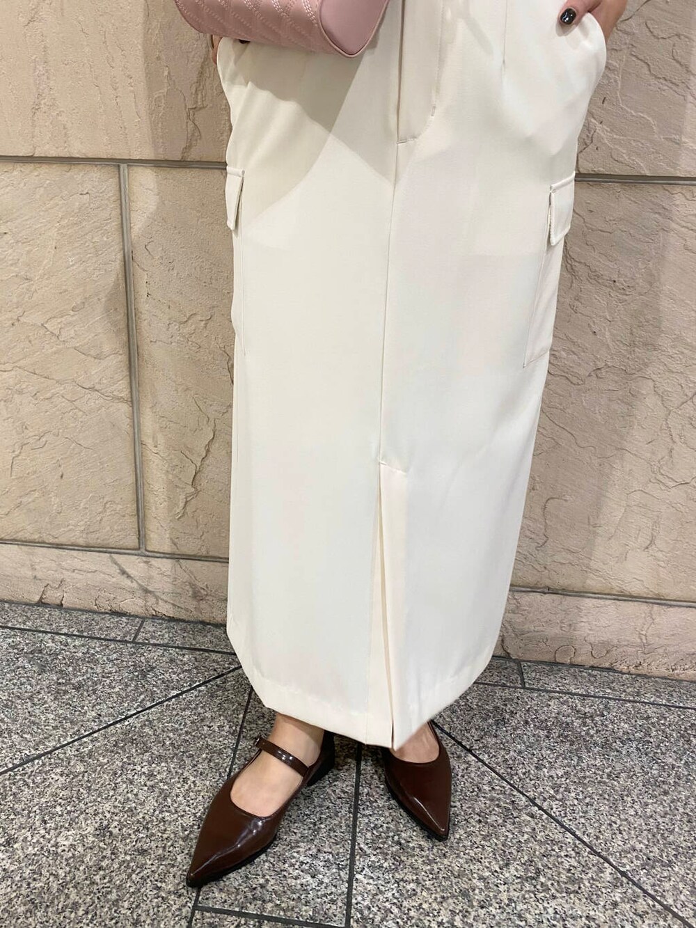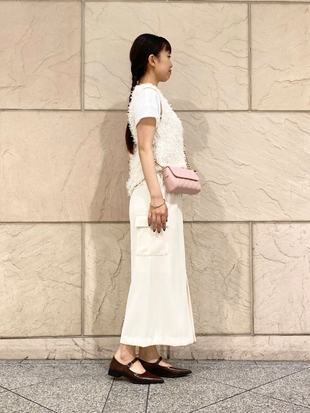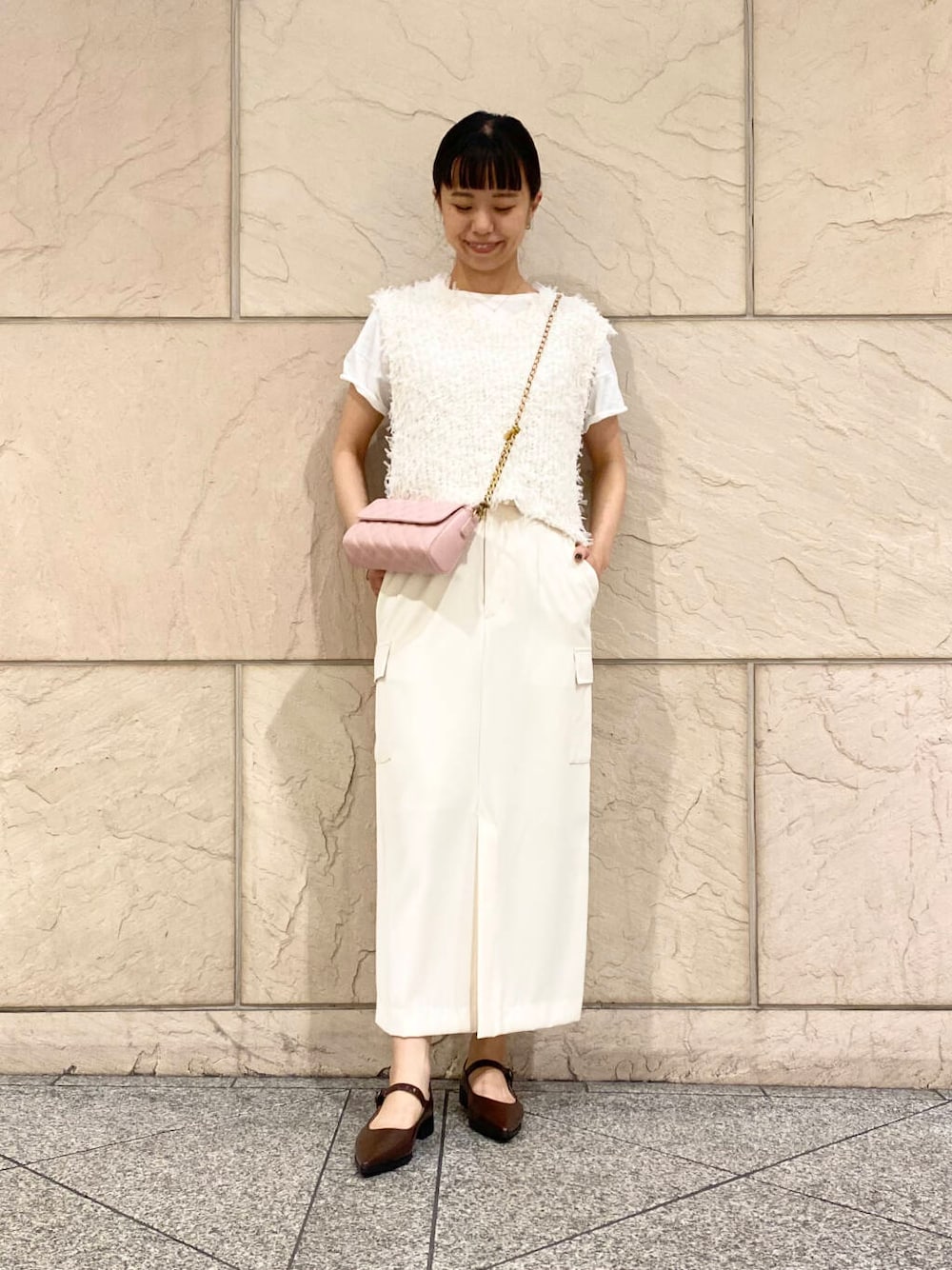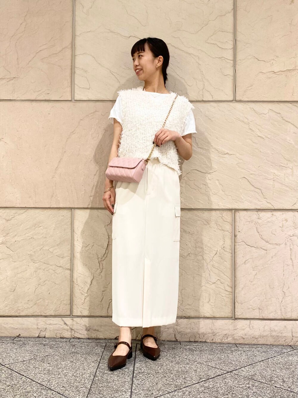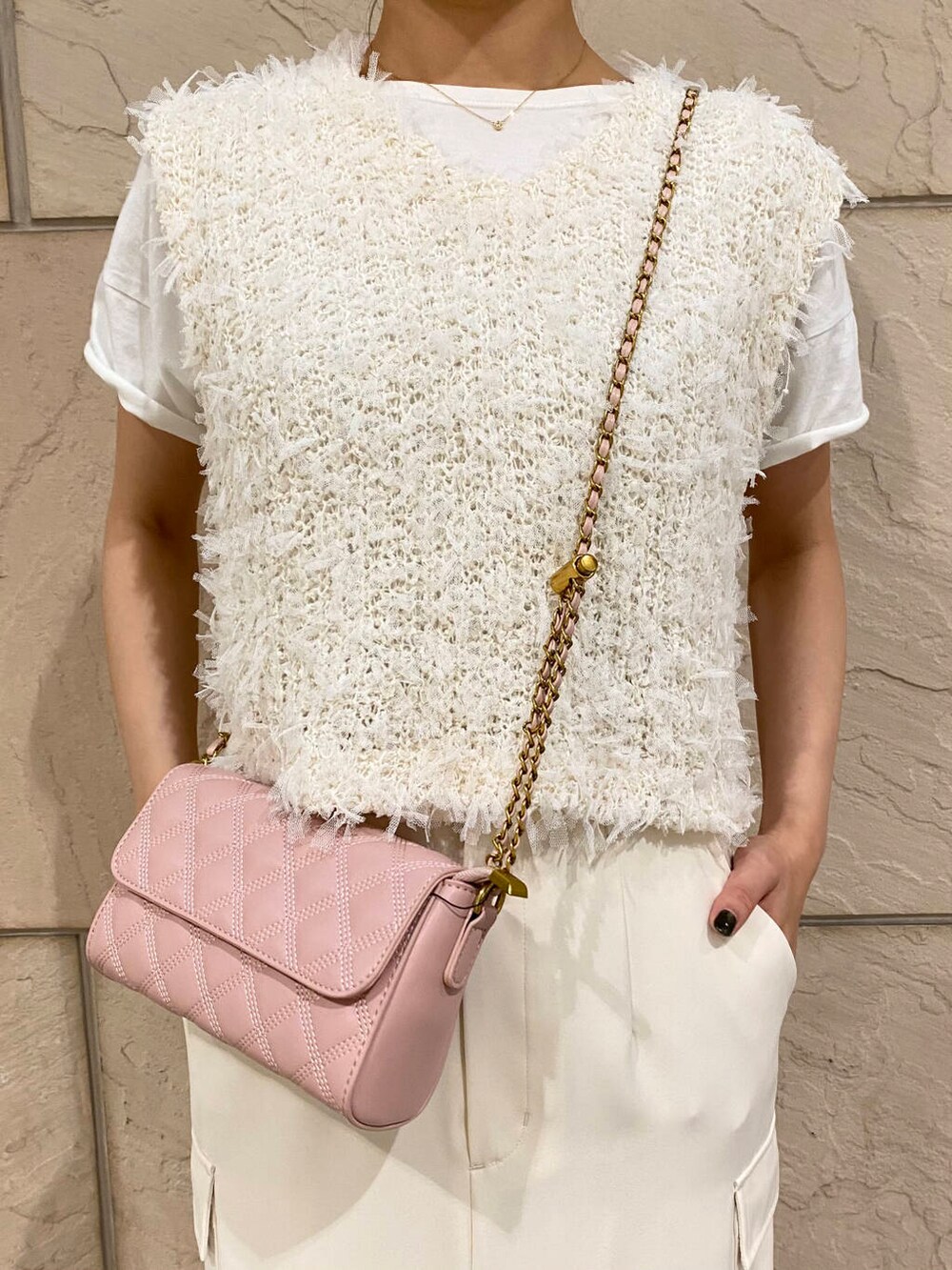 ピンクのキルティングバッグでウエストマークしてます◎