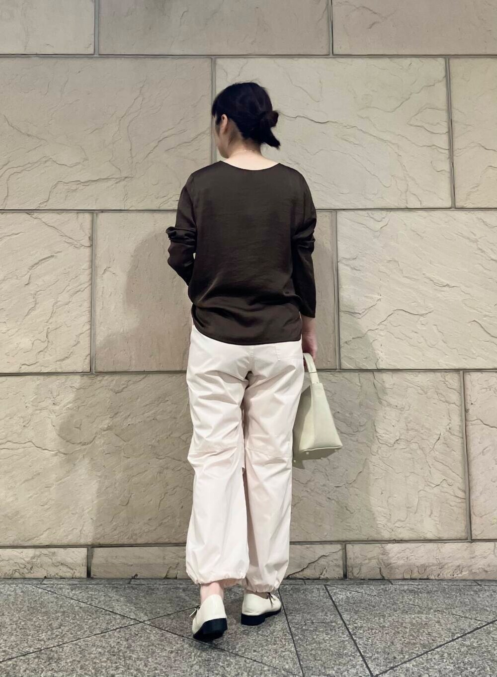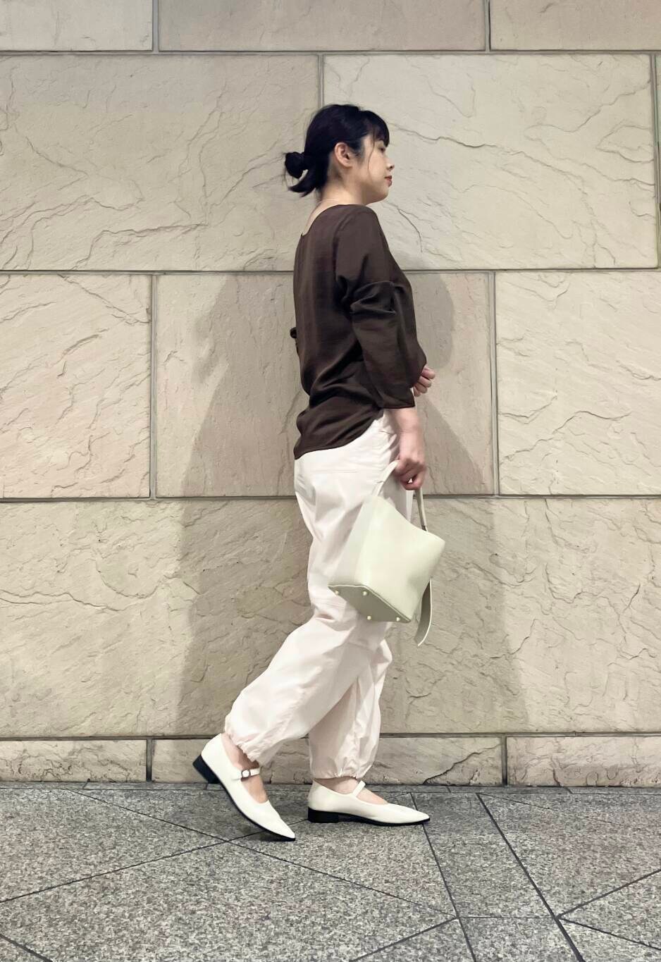 パラシュートパンツは光沢感があり、サイドにバックが入っているのでカジュアルになりすぎずに着用いただけます!