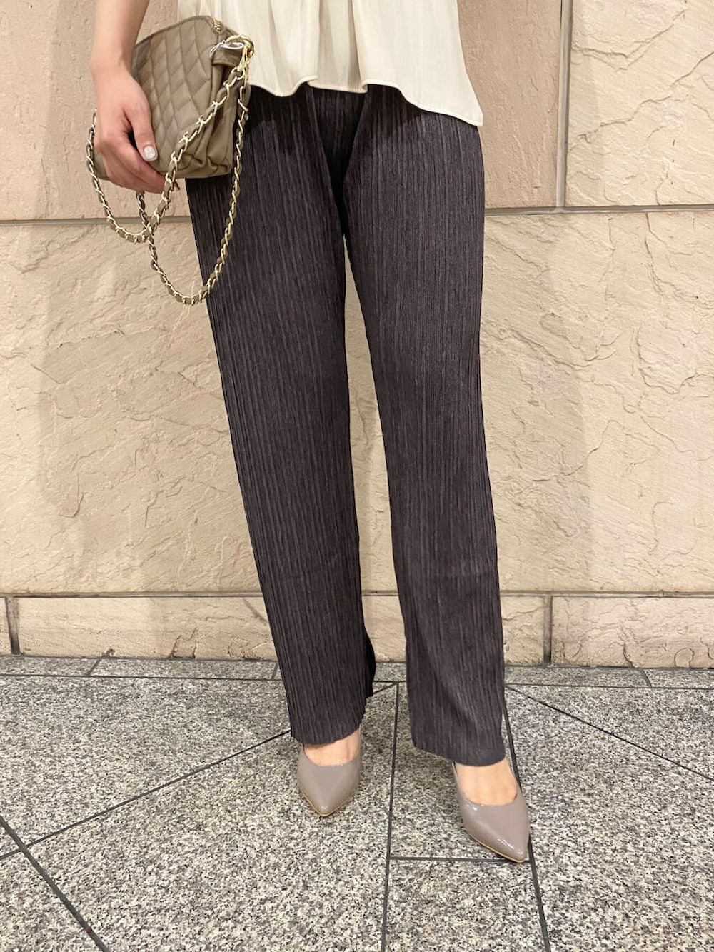 バッグとシューズはヌーディーなカラーで◎