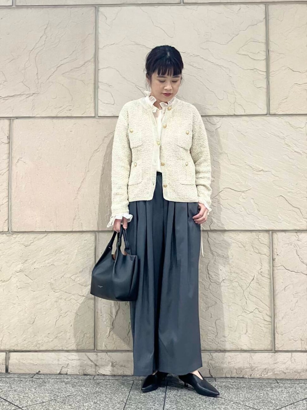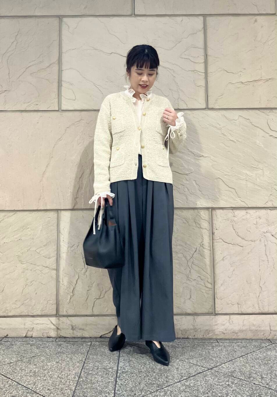 ブラウスのネックとカフスのフリルが品があり程よく華やかさもプラスしてくれます!