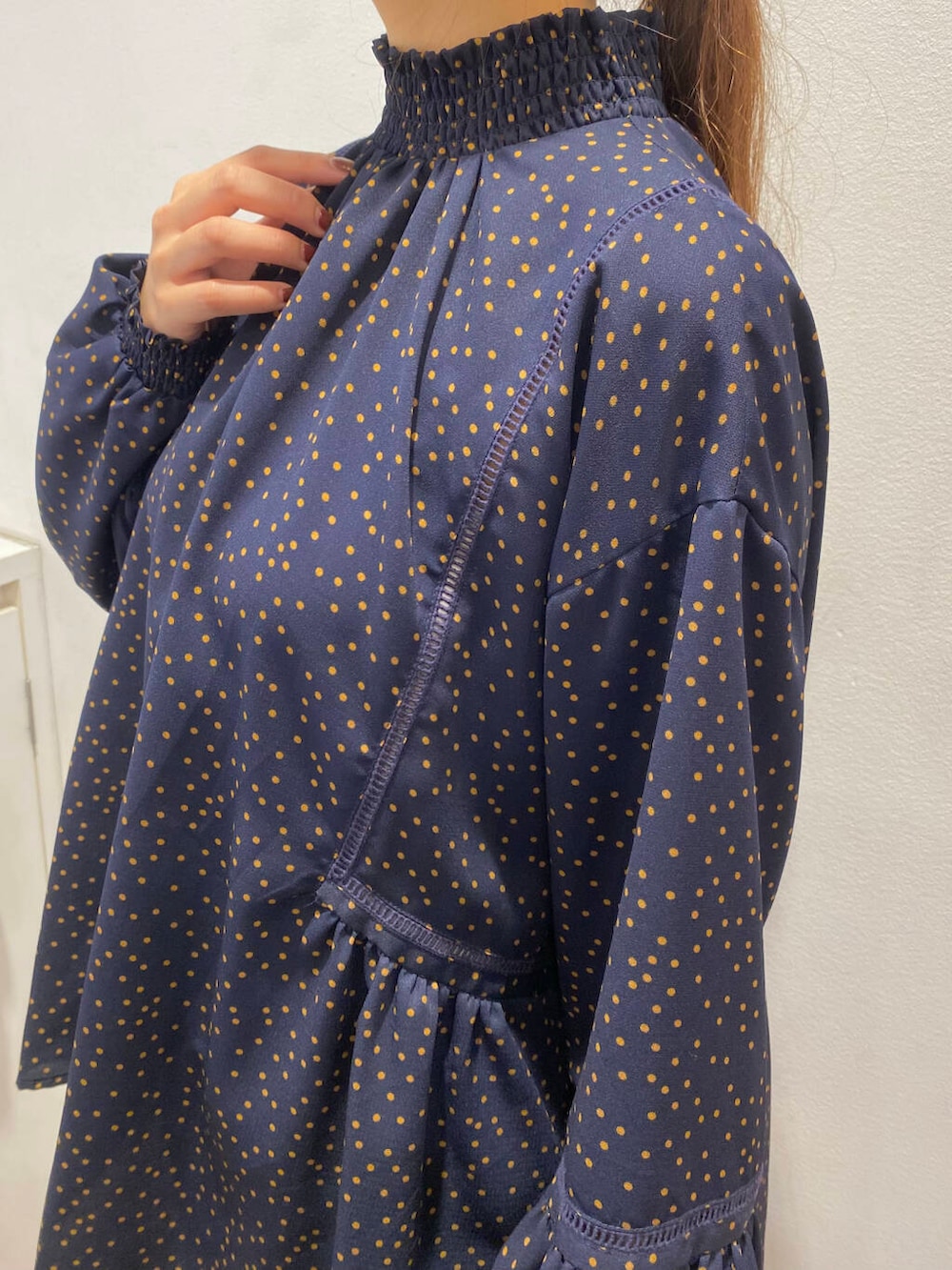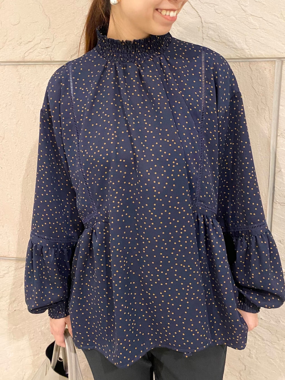 たっぷりのギャザーや、身頃と袖に施されたハシゴレースがかわいい!
