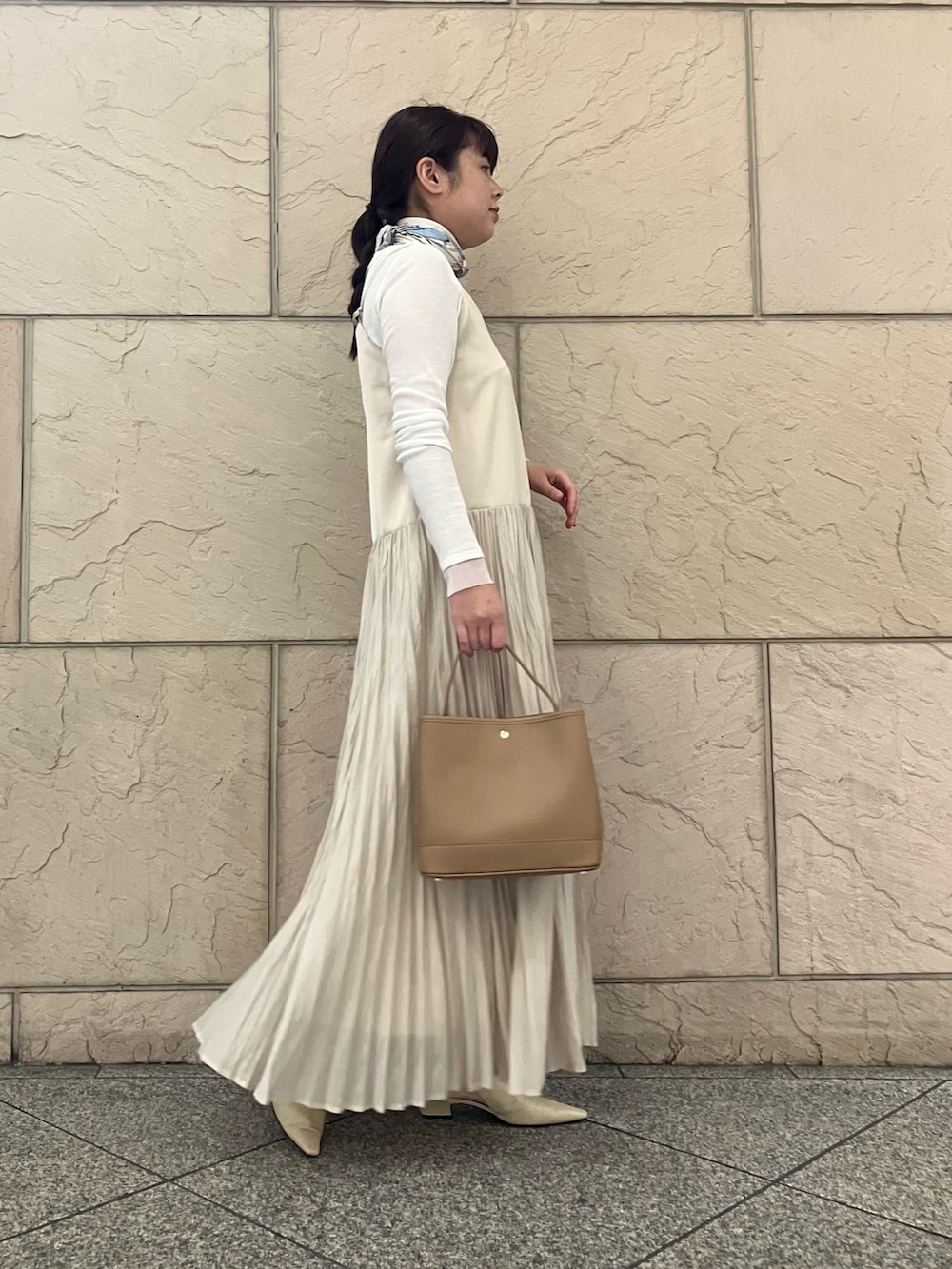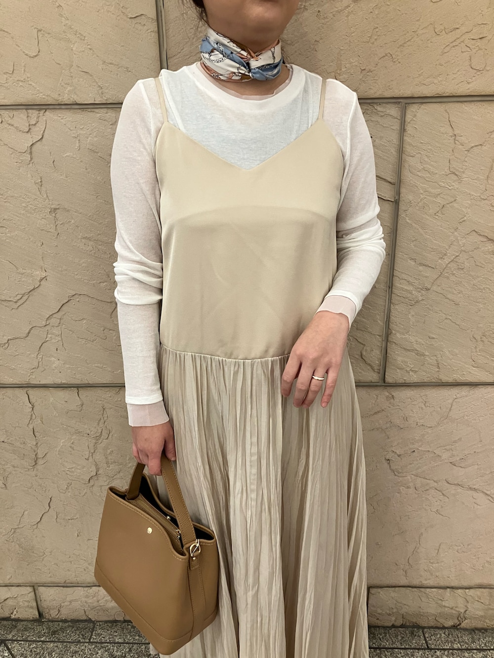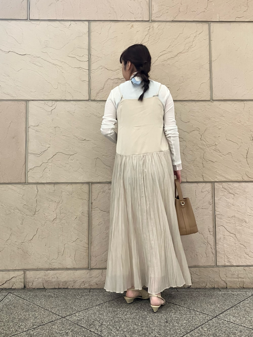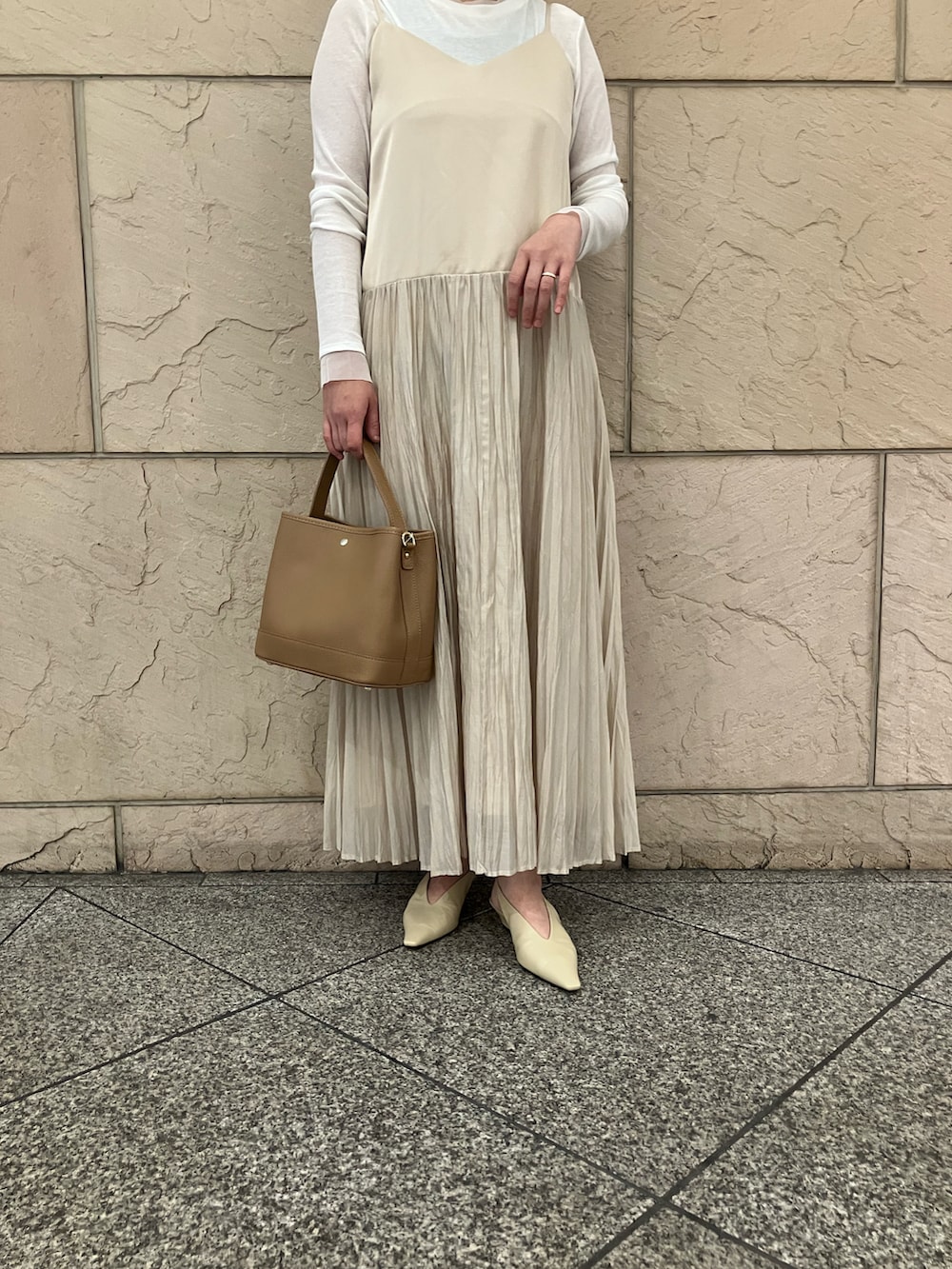 前後2WAYで着用できるキャミワンピースめす。プリーツドッキングなので上からニットやカーディガンを羽織るとまた雰囲気を変えてスタイリングできます。
