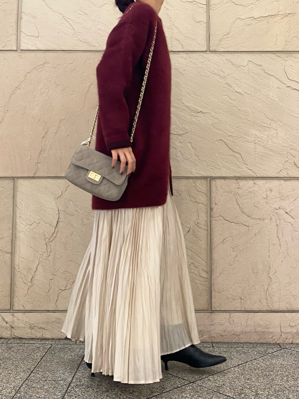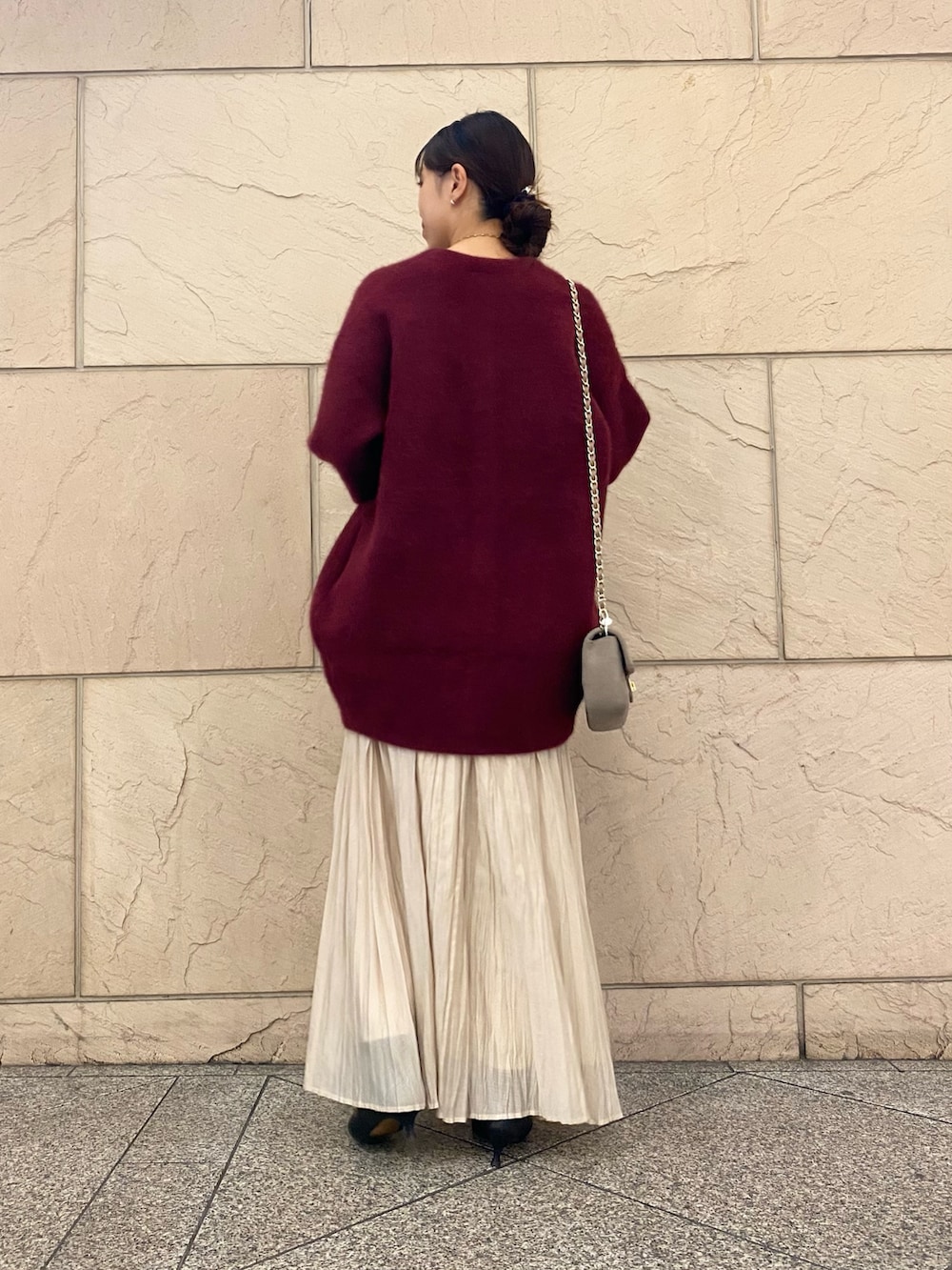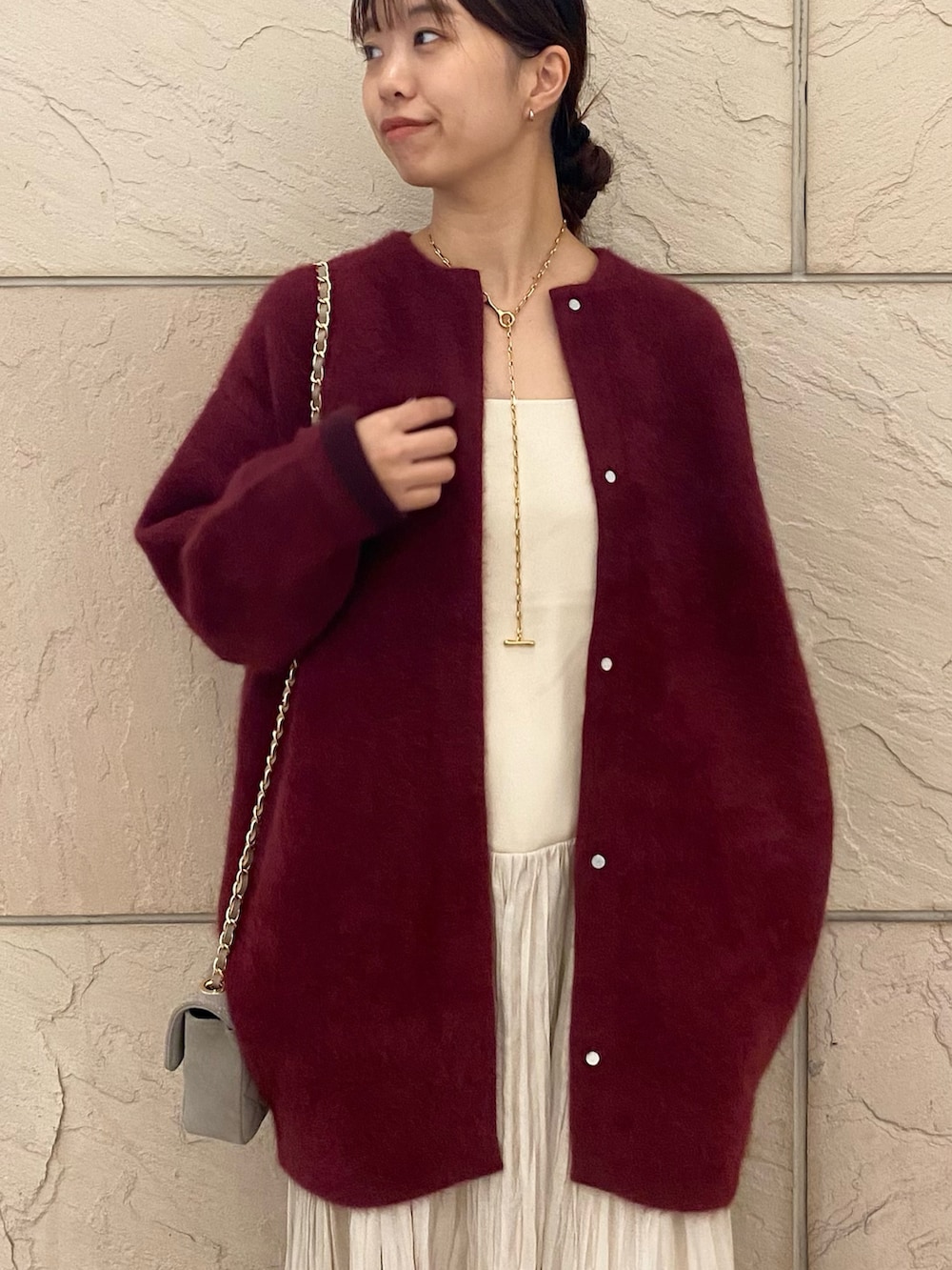 色気のあるボルドーが目を引くニット。