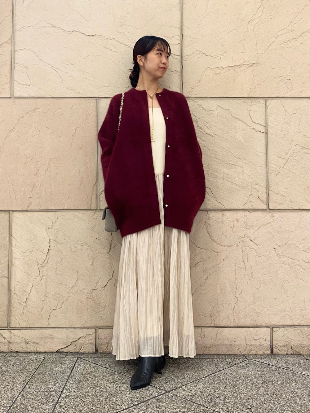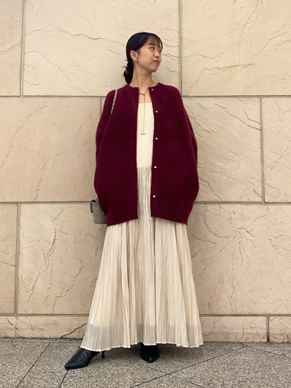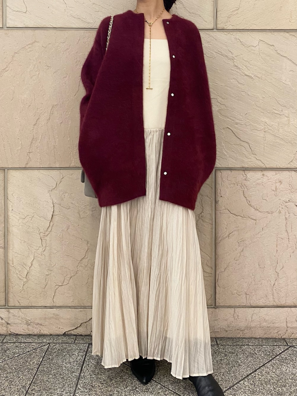 色気のあるボルドーが目を引くニット。