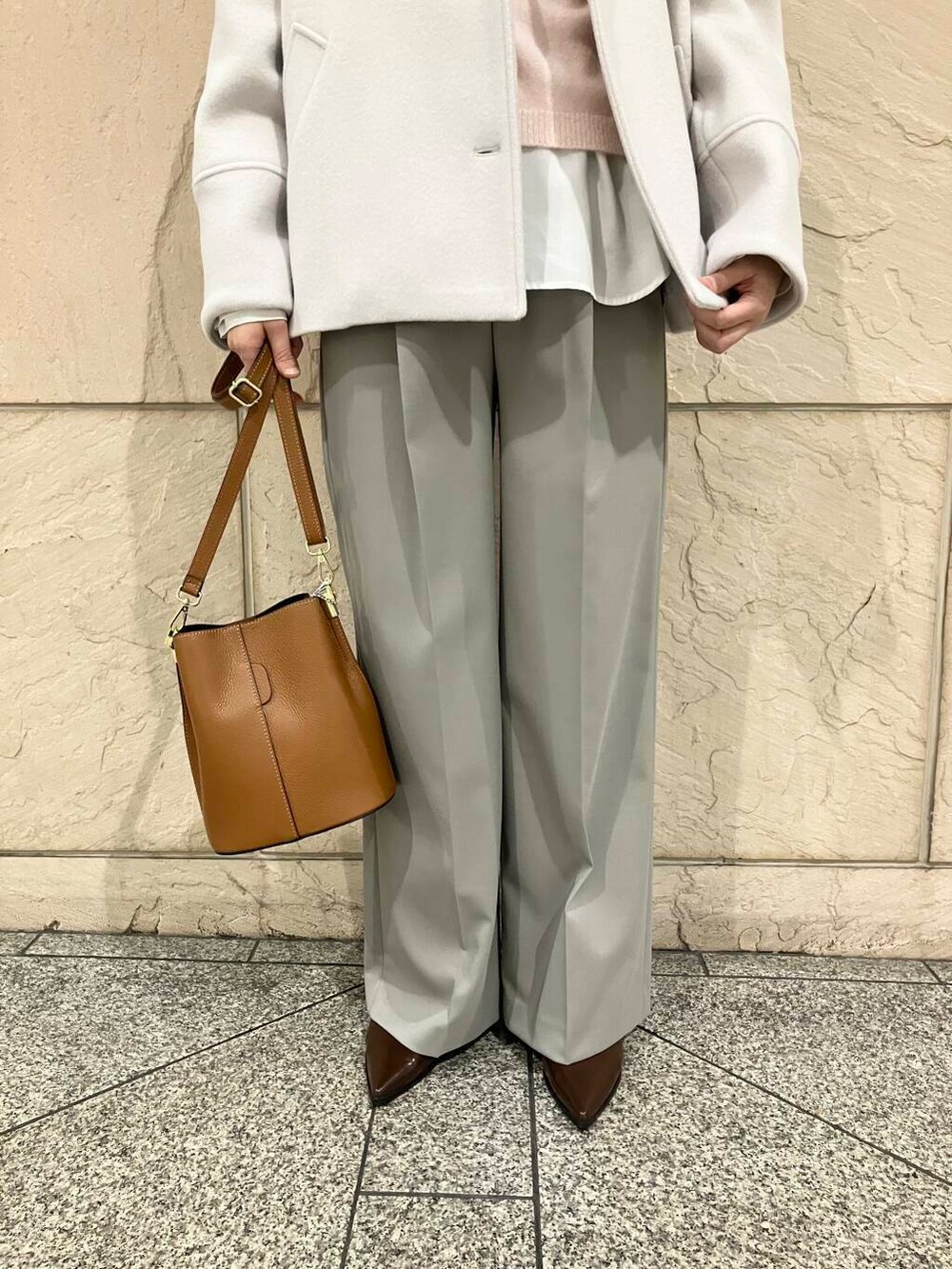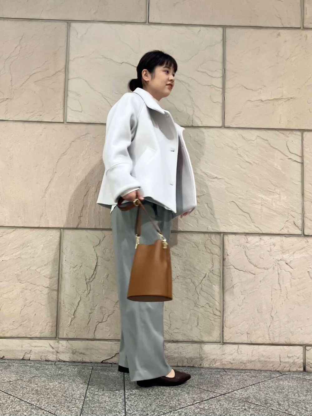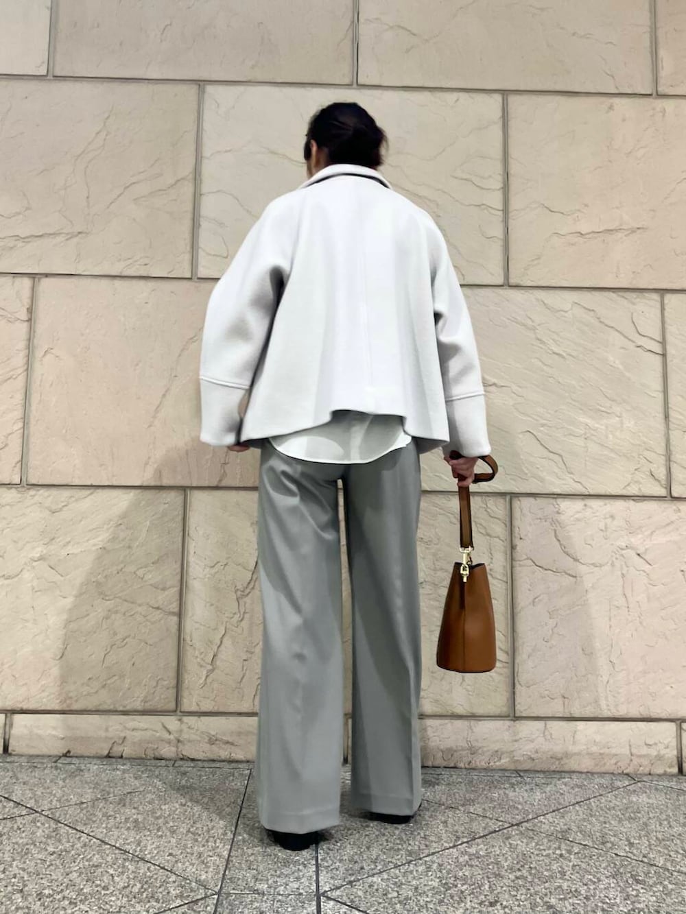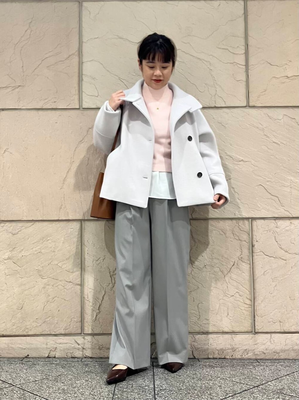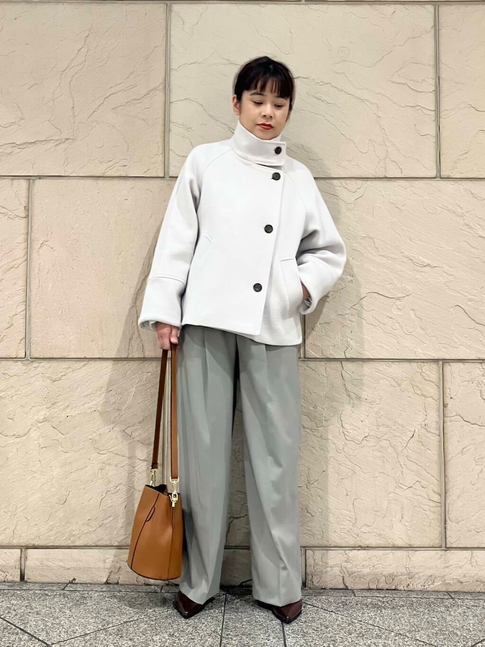 コートはスタンドカラーにもできて襟元で雰囲気を変えていただけます。