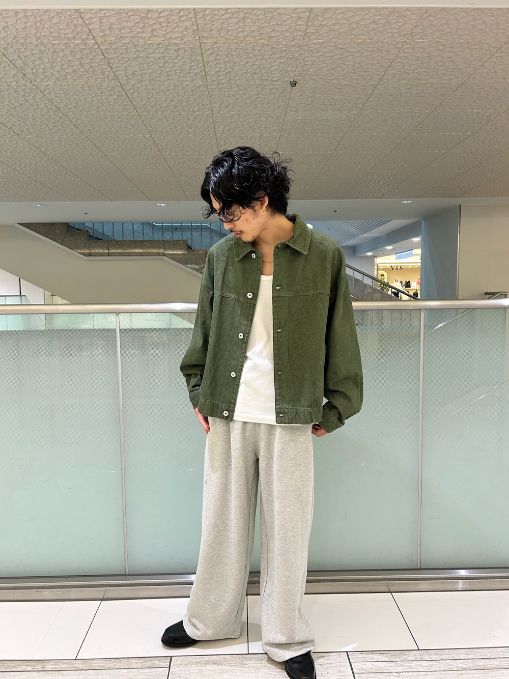 グリーンのデニムにワイドシルエットのスウェットパンツを合わせました!