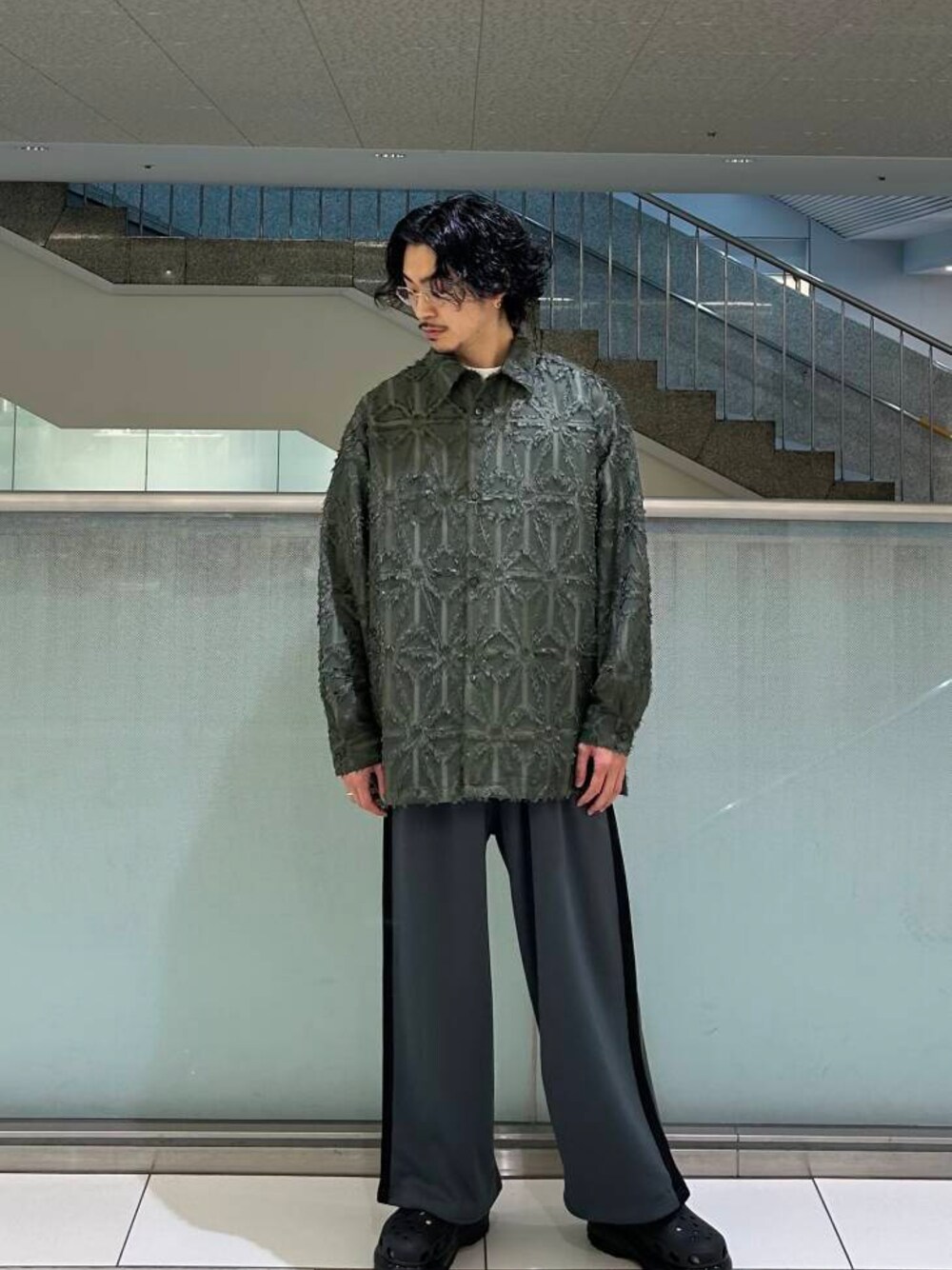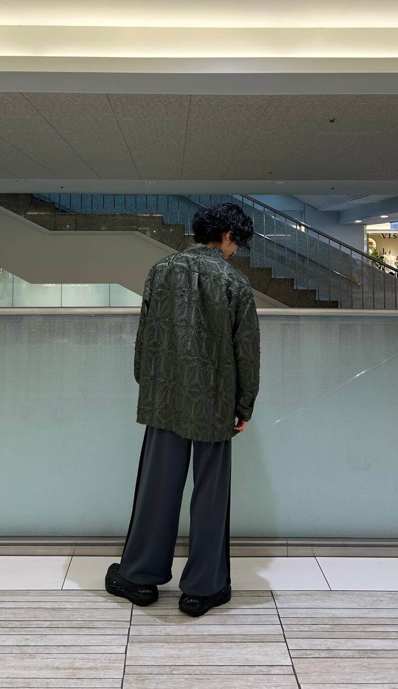 新作のフリンジジャガードレギュラーシャツのグリーンにジャージラインワイドパンツのグレーを合わせて統一感のあるコーディネートにしました!