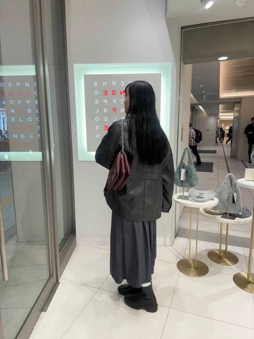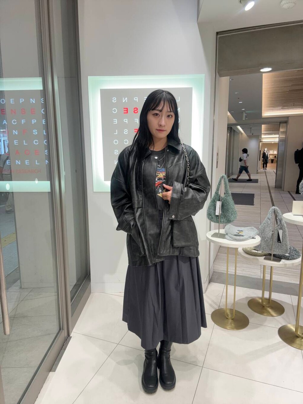 アウターはレザーライクジャケットを羽織ってカッコよく仕上げてみました🖤