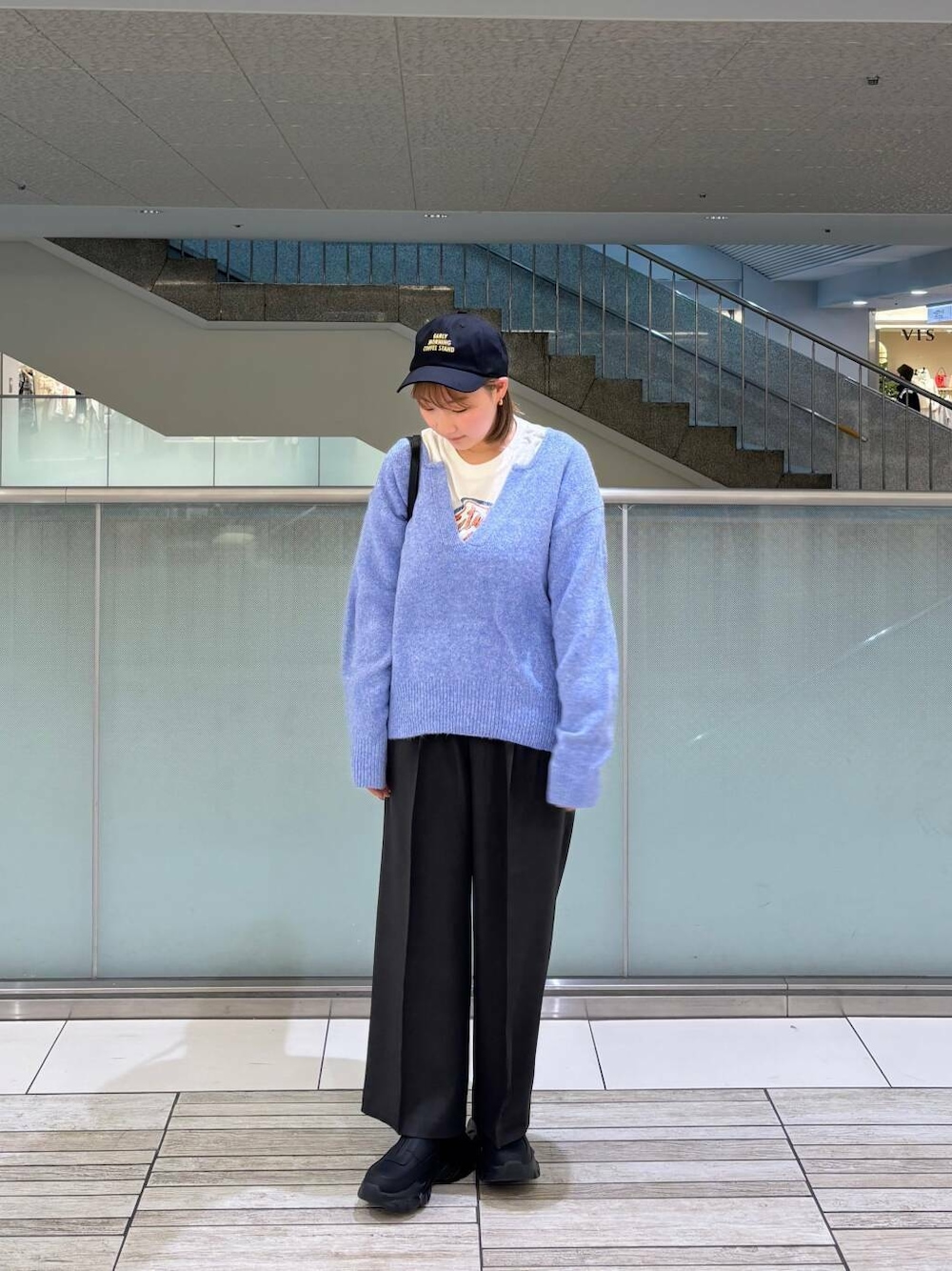 着用しているニットは4色展開でセールにもなっているアイテムなのでとてもお買い得で春先まで着れるのでオススメです!
