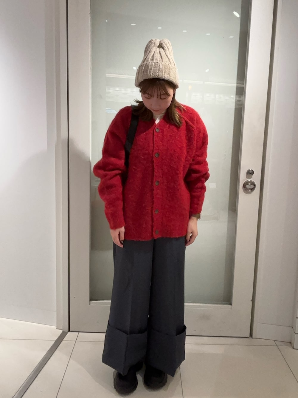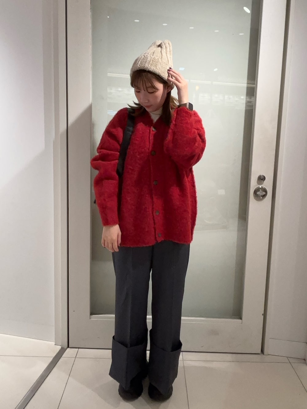 ニットを赤にすることでアウターを羽織っても暗くなりすぎないのがこのコーデのポイントです♡