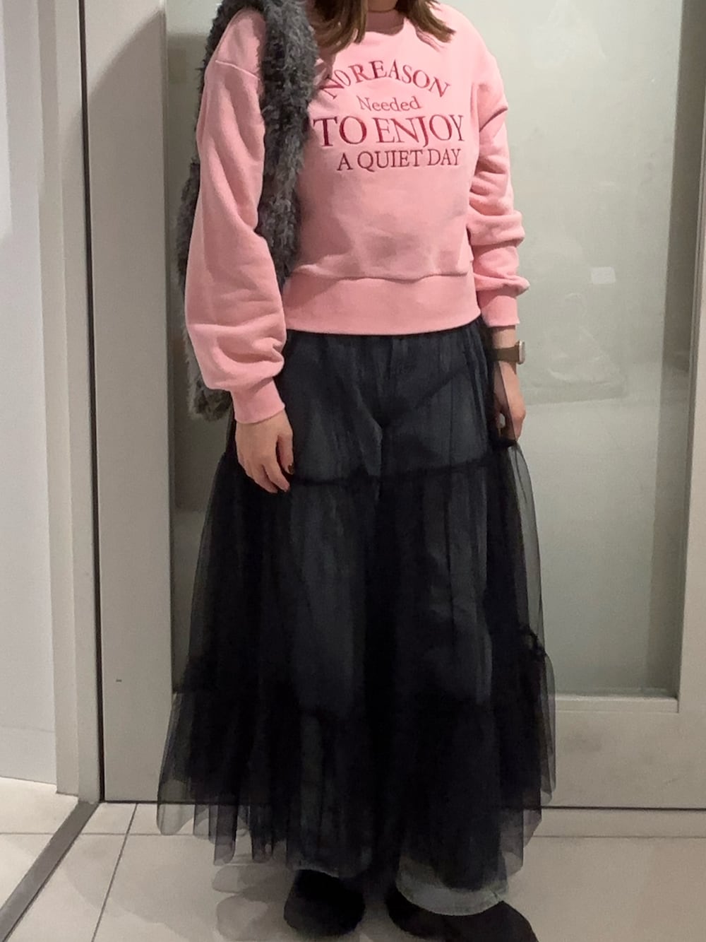 カジュアルコーデにアクセントでチュールスカートをレイヤードしてトレンド感のあるコーデに🤍
