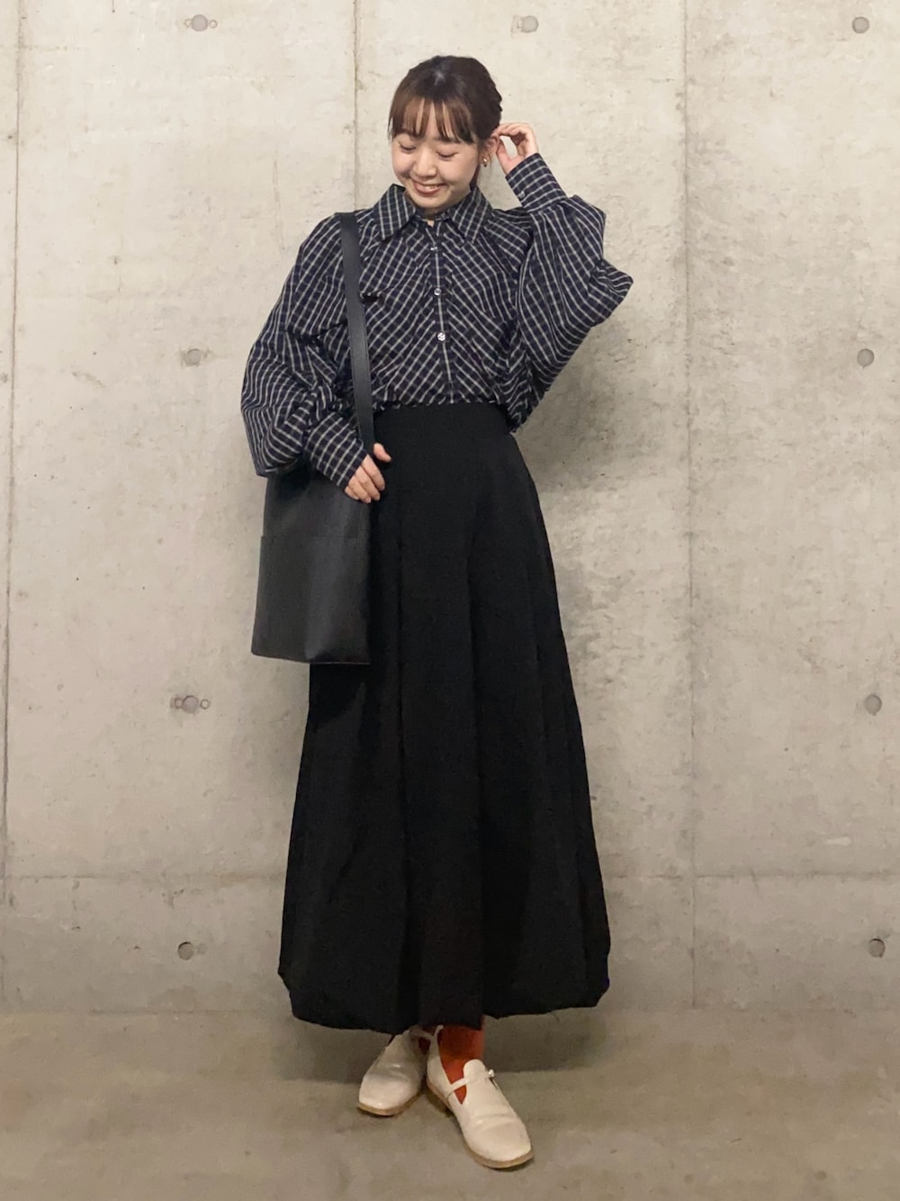 チェックシャツをアクセントに黒でまとめて、足元にカラーを入れてみました🥺🍊