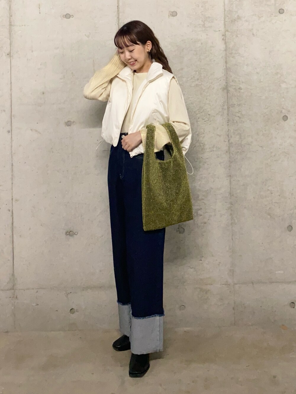 パフベストはショート丈な上、ドローコードで調整可能なので低身長さんにもおすすめです◎