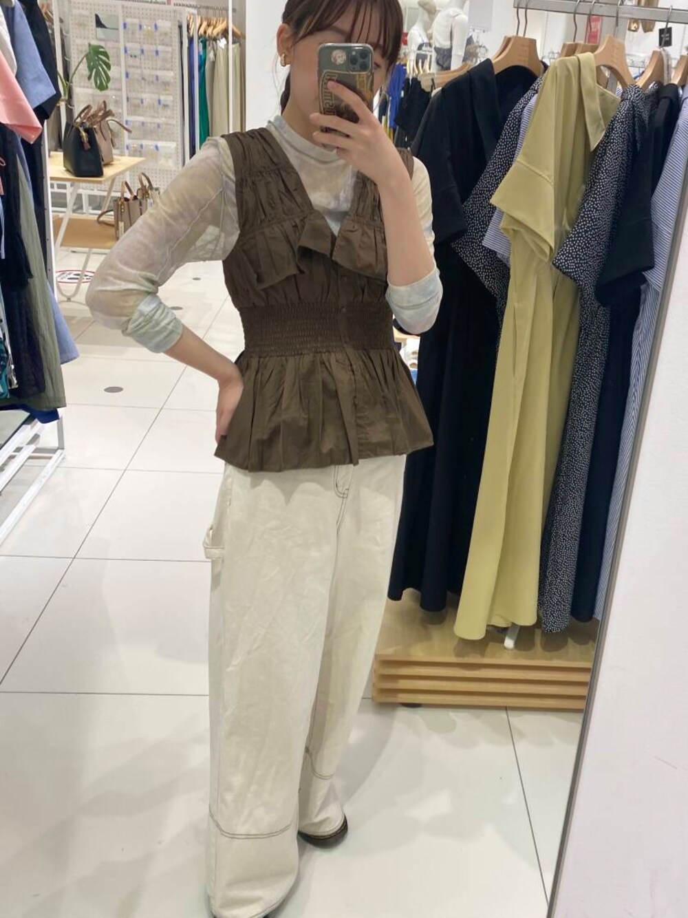 キャミソールと合わせてそのまま着るのもありですが、コンパクトなTシャツやシアートップスと合わせると秋も映えるコーデに🍁