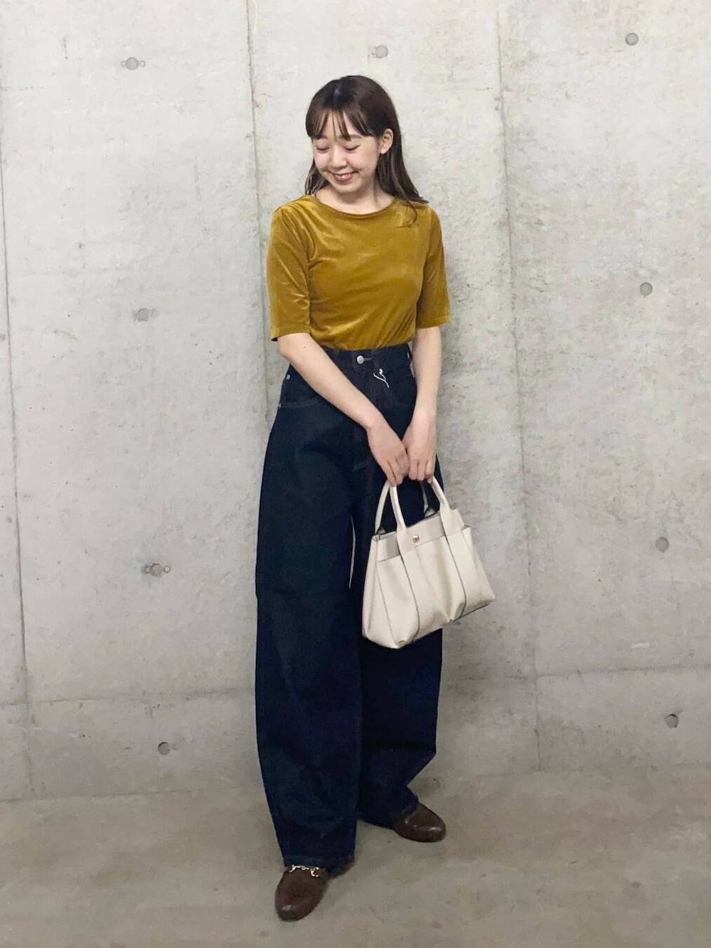 さりげない濃いオレンジのステッチがマスタードのトップスと相性バッチリ◎