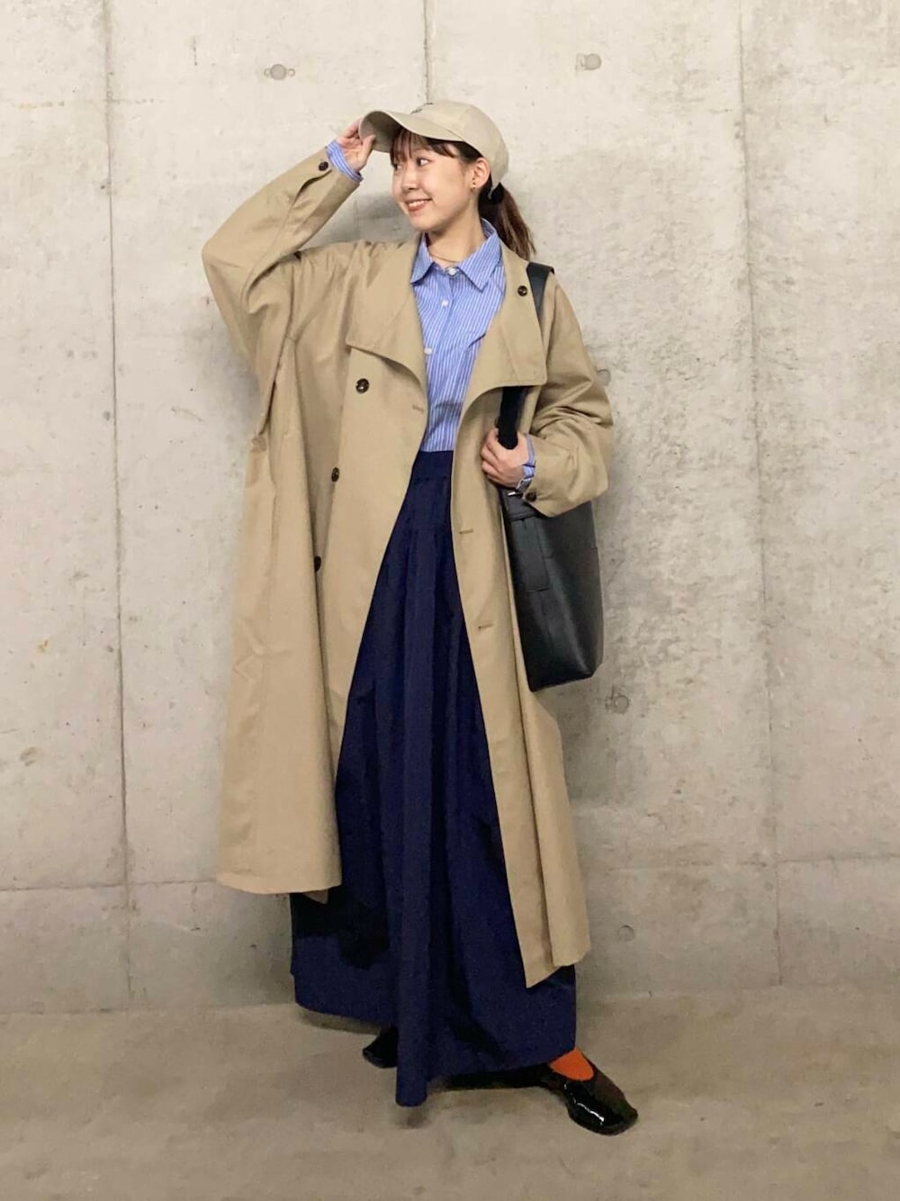 トレンチコートとベージュ×ネイビー系で大人カジュアルな色味にしつつ、差し色のオレンジで可愛らしさも取り入れてみました〜!🍊