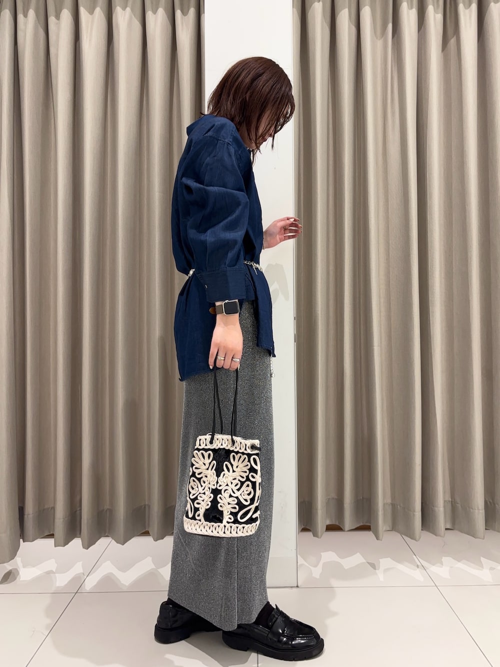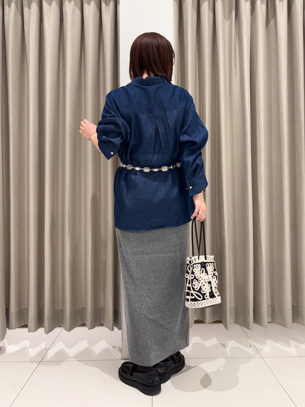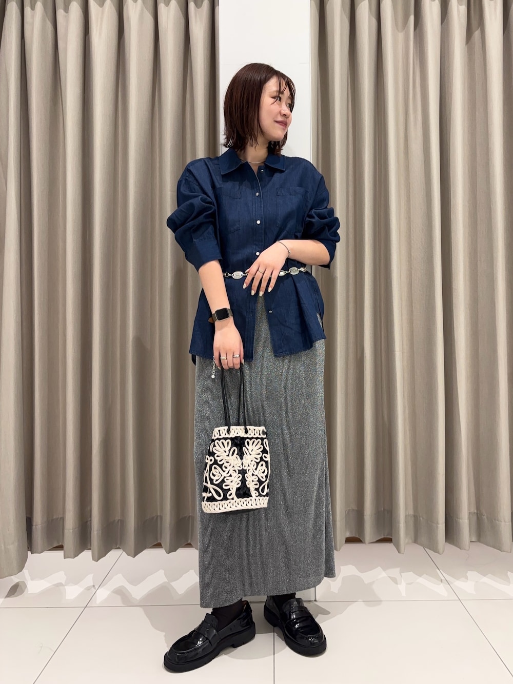 秋っぽさ抜群のデニムシャツにラメスカートを合わせた秋先取りコーデ⸜ ෆ ⸝