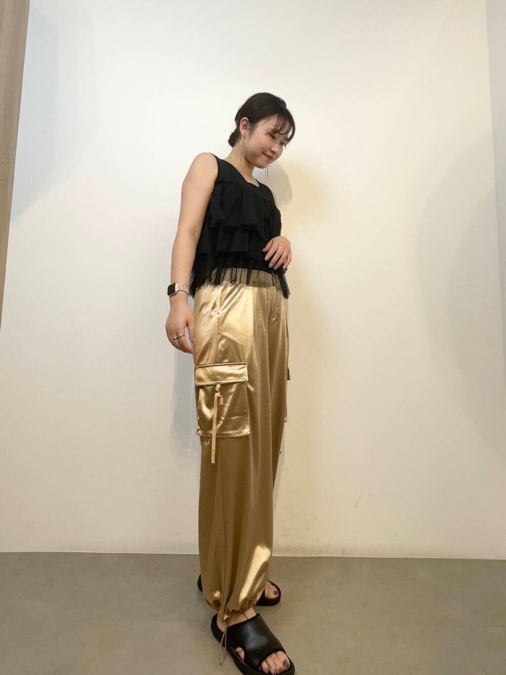 サテンカーゴパンツは、光沢感のある生地なので、カジュアルすぎが苦手な方でも、挑戦できるパンツです!