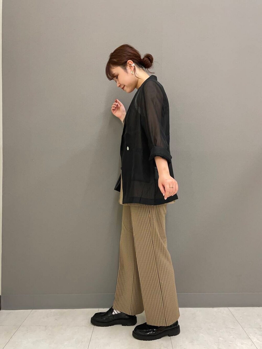 新色のチェック柄セットアップにシアージャケットを合わせた大人オフィスコーデです!