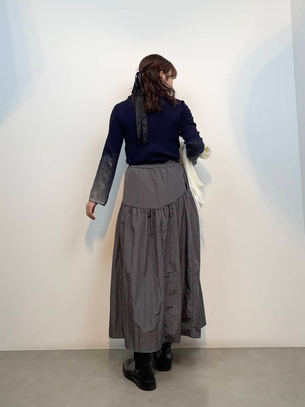 袖のハクプリントがおしゃれなリブセーターは、キレイめなボリュームスカートと合わせて、秋のお出かけコーデにෆ.*・゚