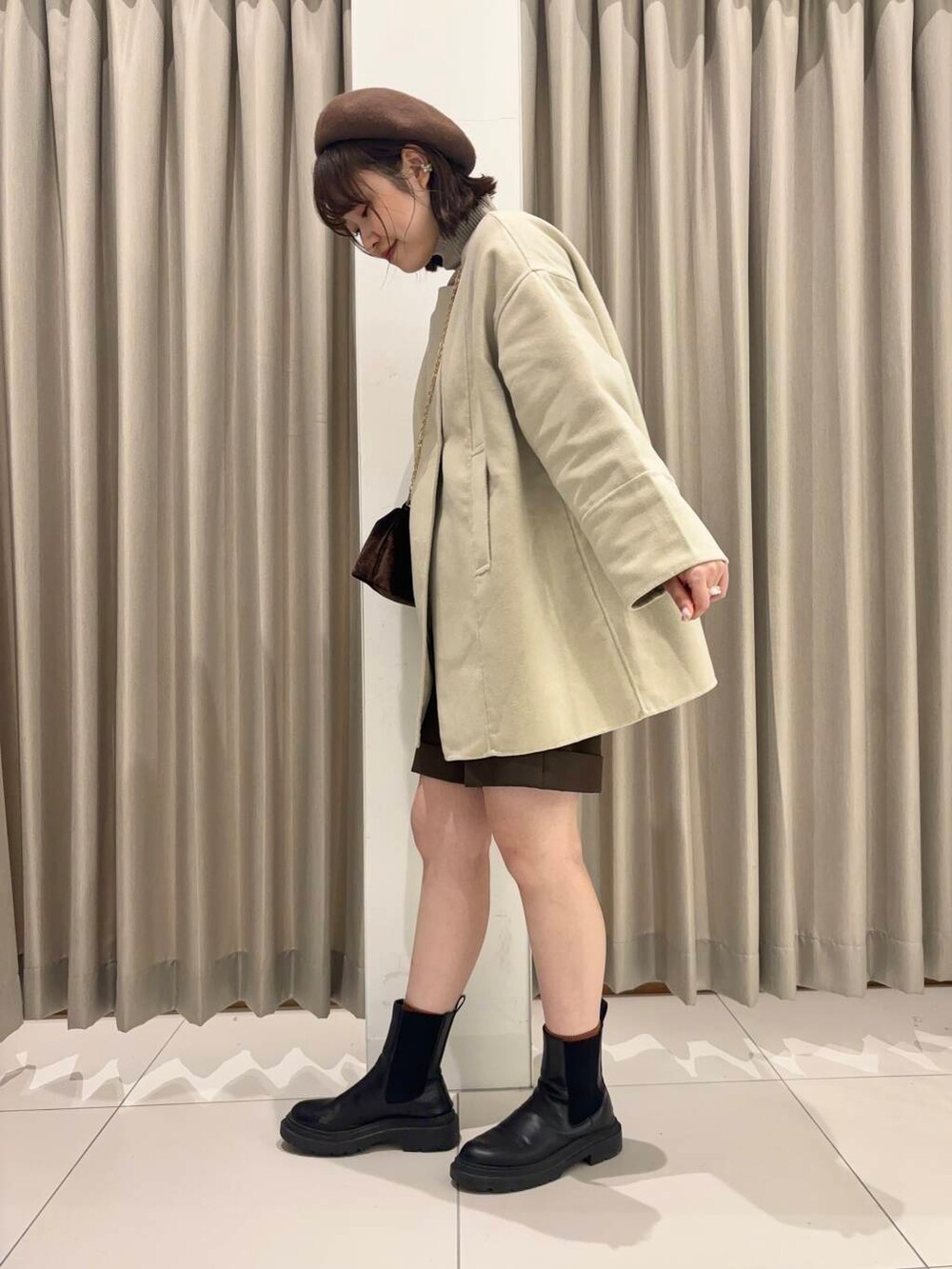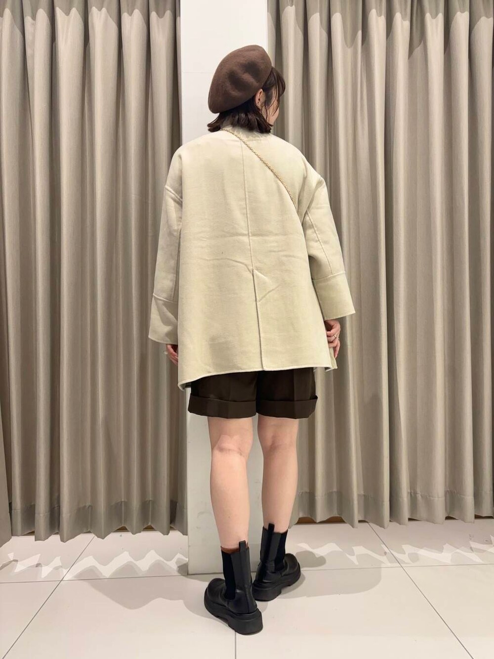 着用のミドルコートは、ヒップ下までの丈感でショートパンツとの相性が抜群です!