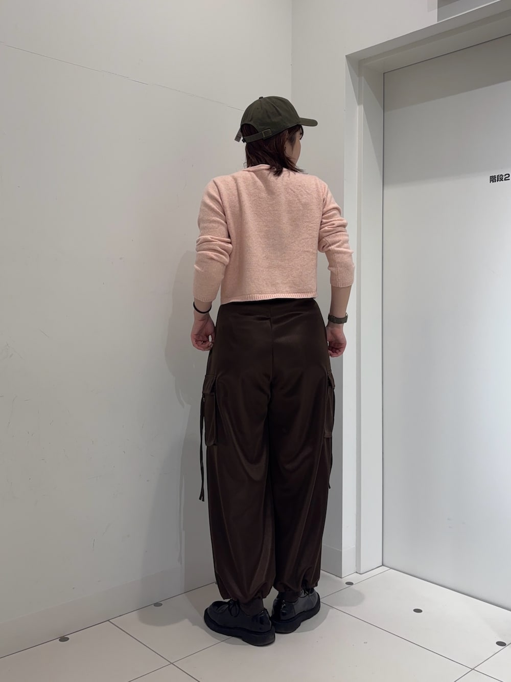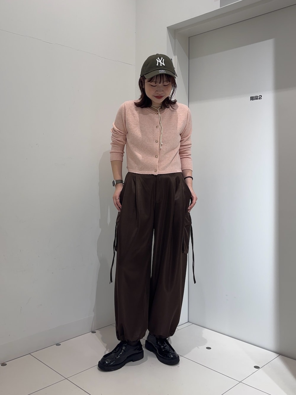 甘めな印象のライトピンクのカーディガンもカジュアルなカーゴパンツとキャップでしっかりカジュアルダウン。