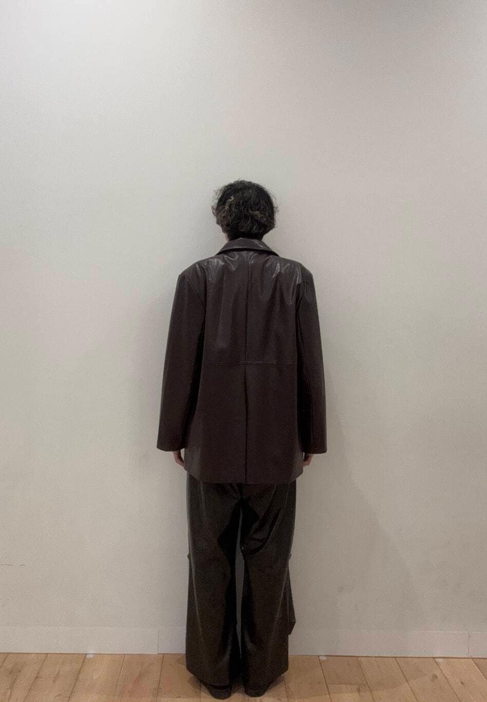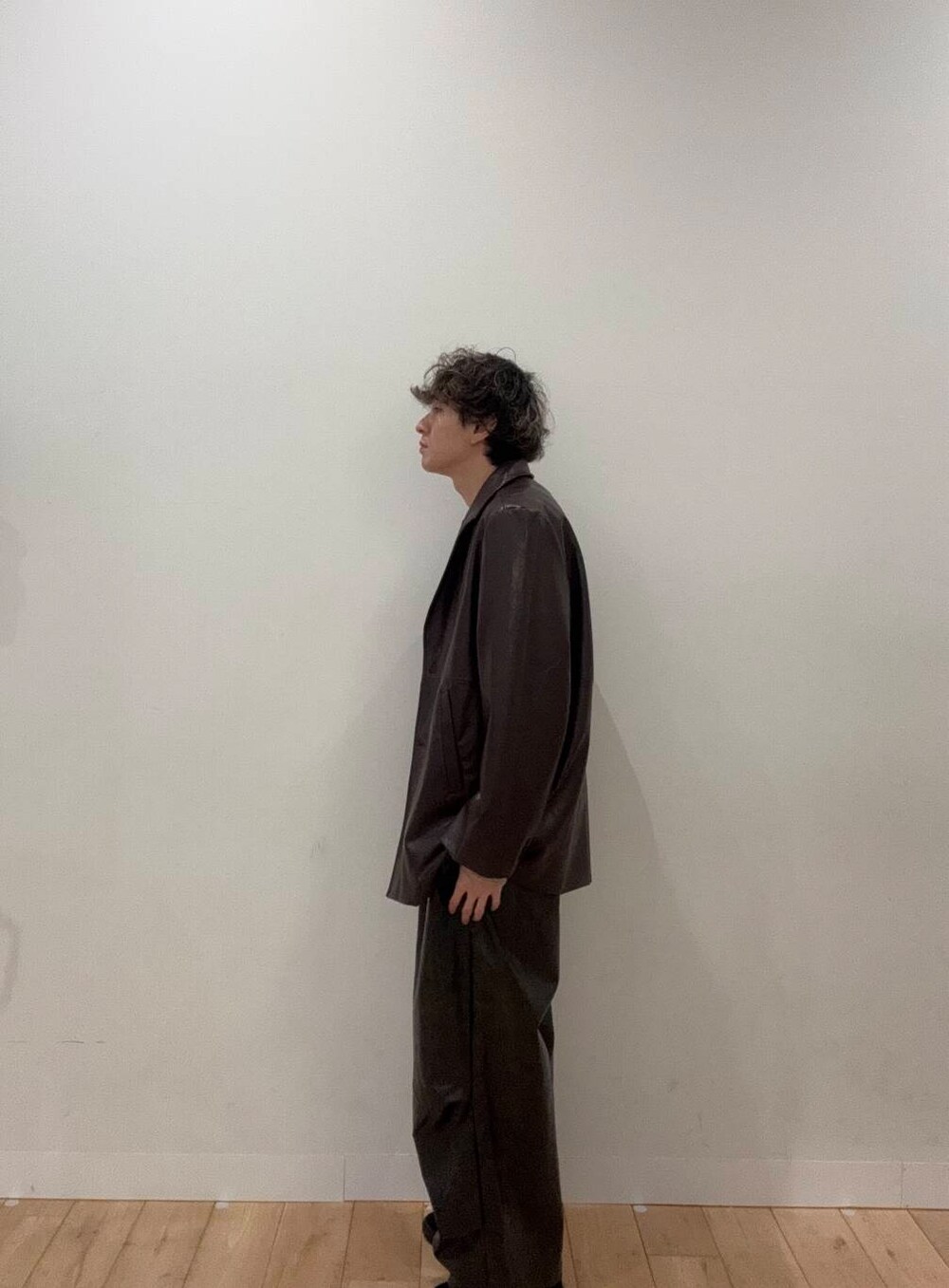 ボトムも素材感を合わせたフェイクレザーのワイドパンツを着用。やや光沢感があるのでダークトーンでも重たい印象にならずメリハリのついたスタイリングにまとまります。
