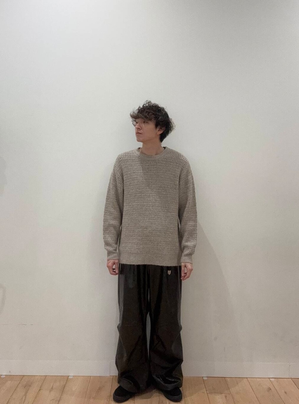 インナーは着回しがしやすいローゲージニット着用。程よいオーバーサイズで女性にもおすすめです。
