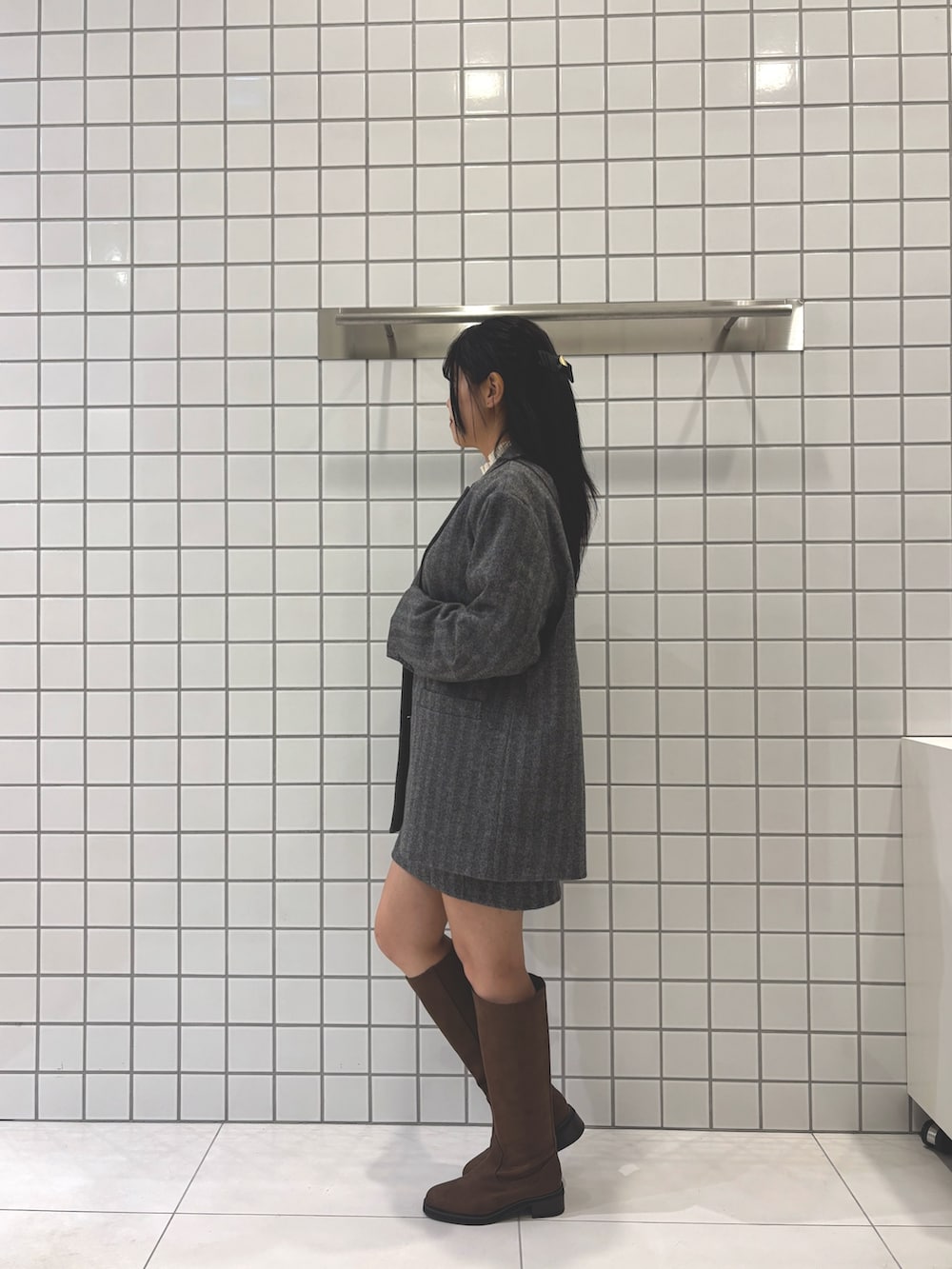 上品なグレーのセットアップにロングブーツを合わせた大人きれいめスタイル🫧
