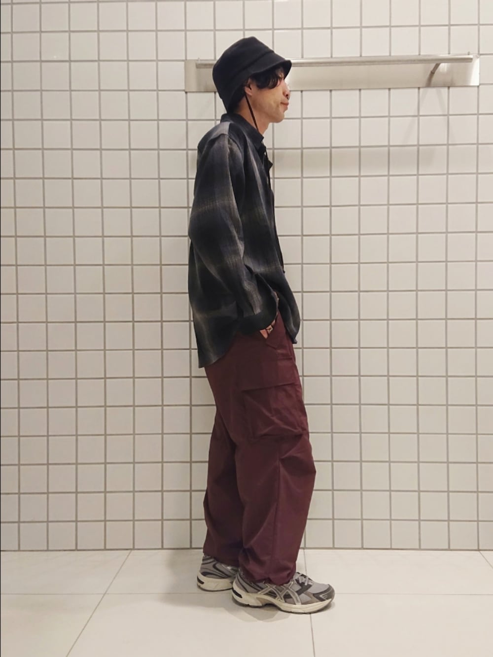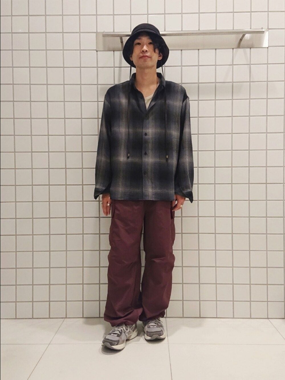 チェックシャツ×カーゴパンツ