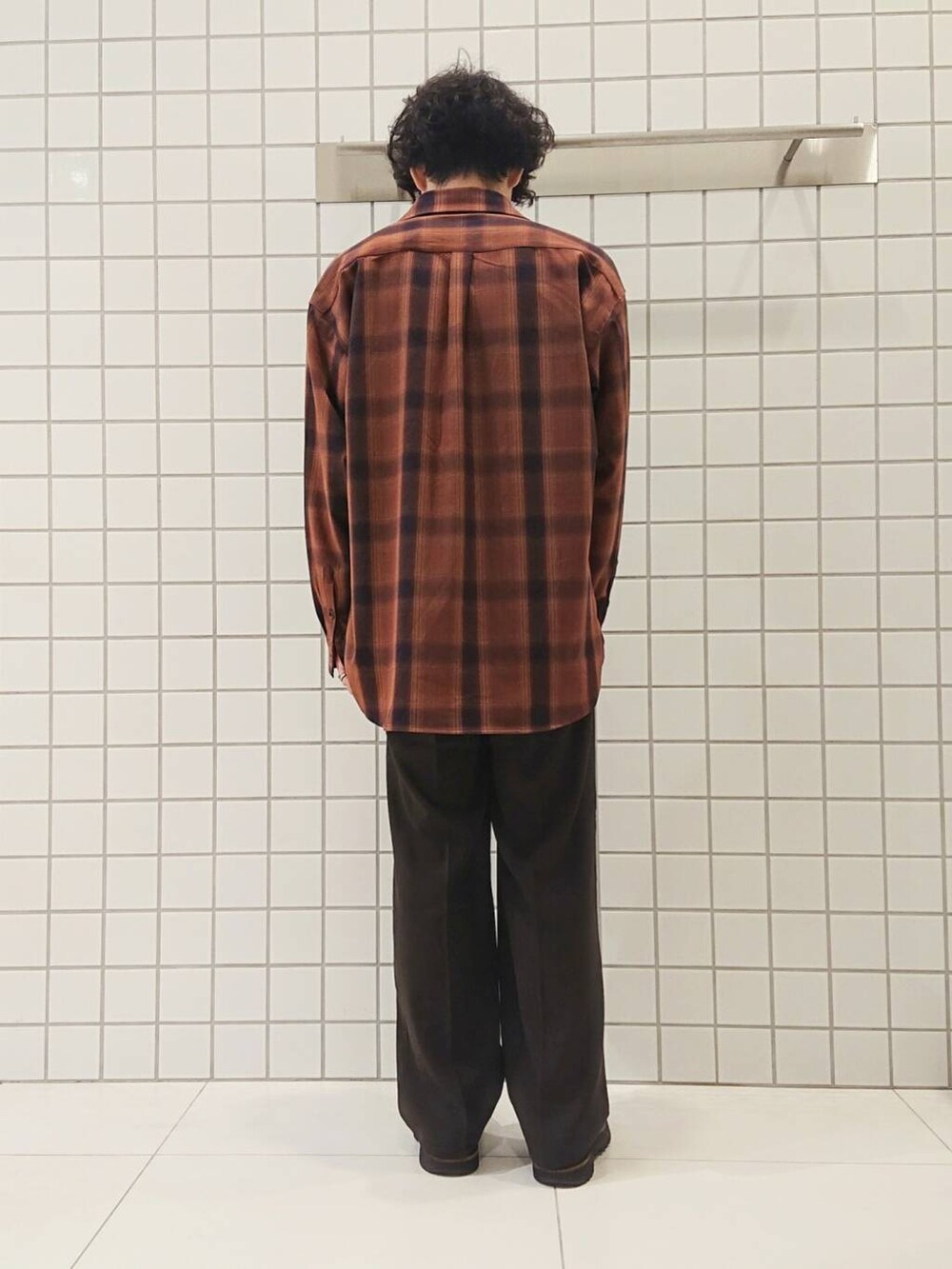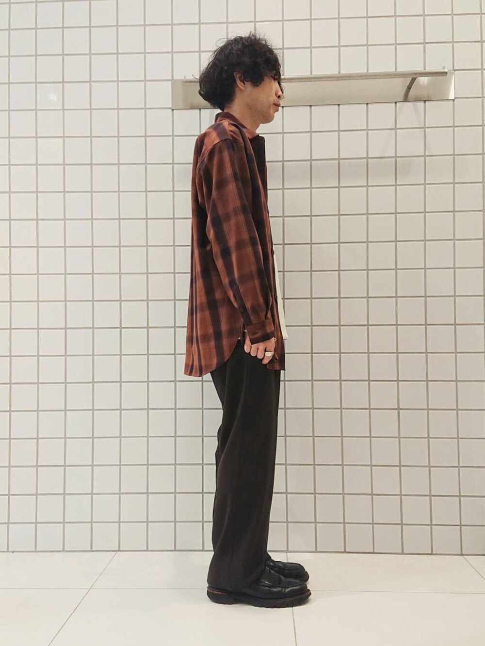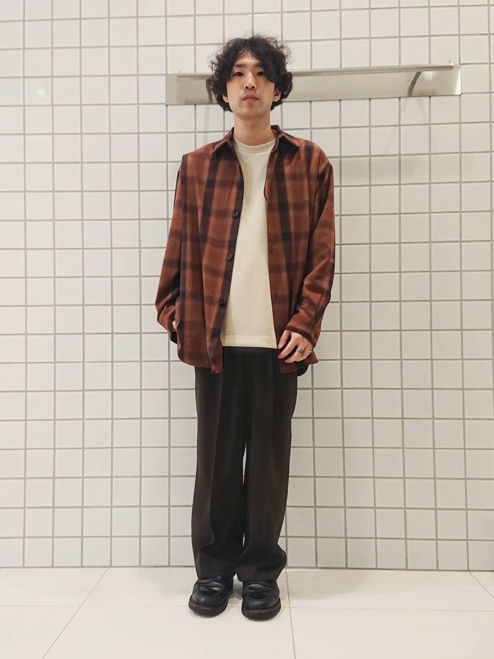 シャツはルーズなサイズ感、高見え、カラーも秋っぽくパンツのブラウンとも相性抜群です〇