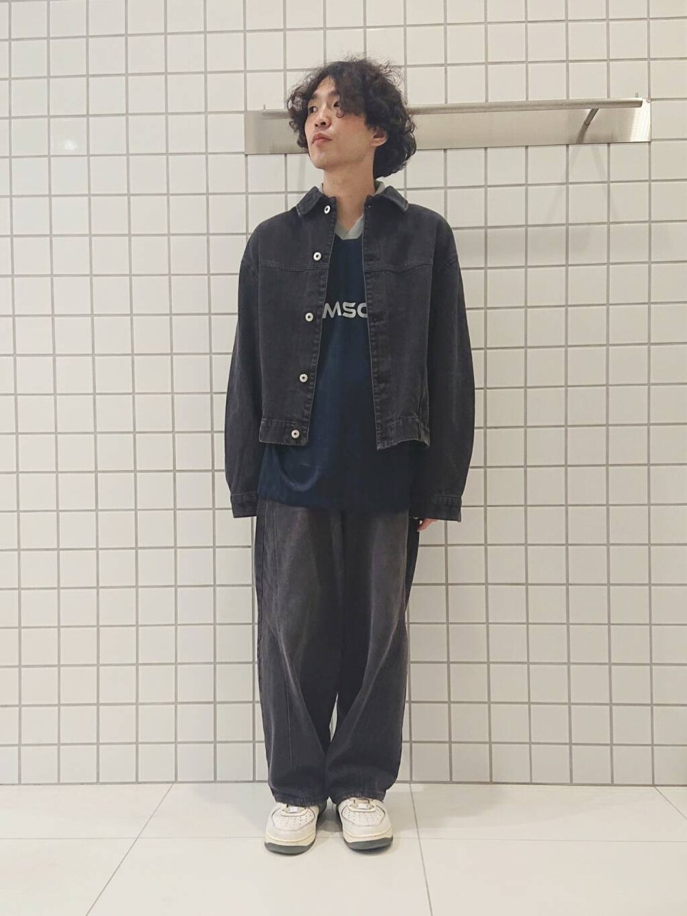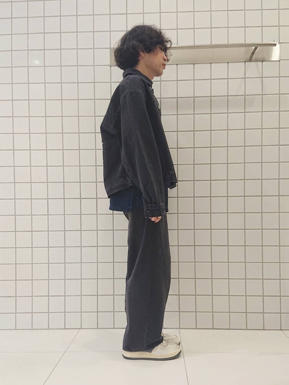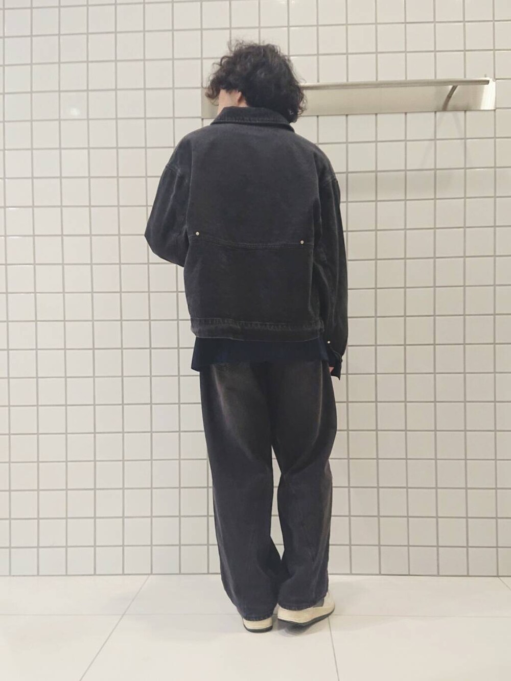 ジャケットは短丈でさらっと羽織りやすく、ブラックのセットアップでありがちな重い印象になりづらいです〇