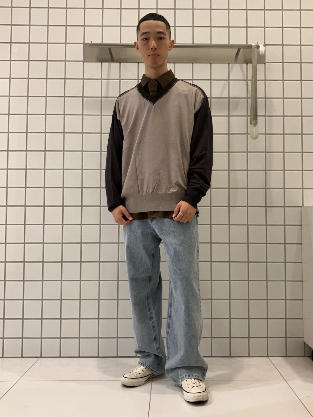 同色のネクタイ付きのシャツは、きれいめスタイルを気軽に実現してくれます。ボトムスはデニムにして、カジュアルにまとめました。